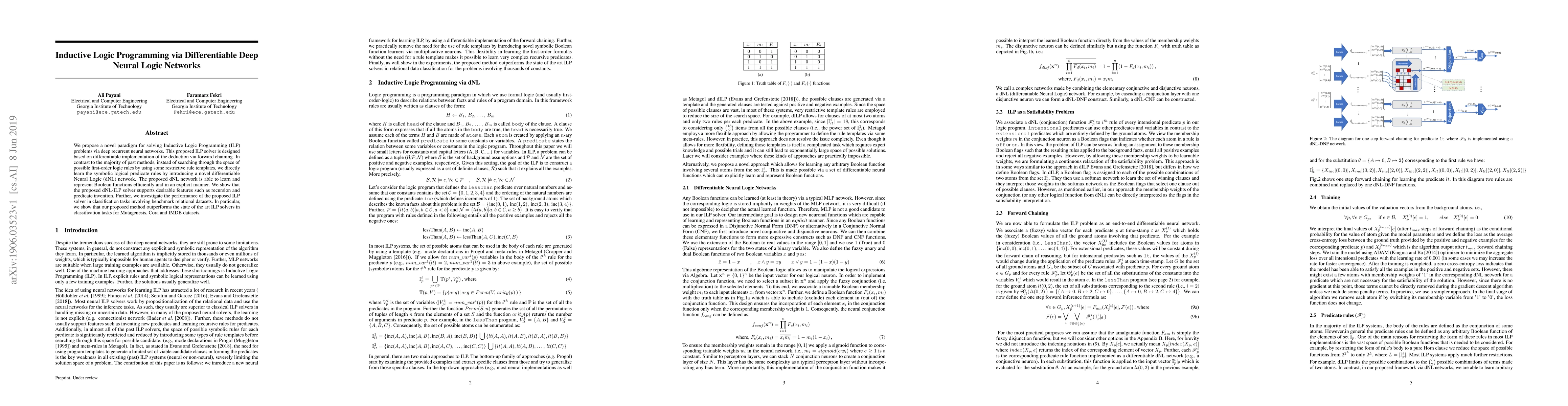 We propose a novel paradigm for solving Inductive Logic Programming (ILP) problems via deep recurrent neural networks. This proposed ILP solver is designed based on differentiable implementation of the deduction via forward chaining. In contrast to the majority of past methods, instead of searching through the space of possible first-order logic rules by using some restrictive rule templates, we directly learn the symbolic logical predicate rules by introducing a novel differentiable Neural Logic (dNL) network. The proposed dNL network is able to learn and represent Boolean functions efficiently and in an explicit manner. We show that the proposed dNL-ILP solver supports desirable features such as recursion and predicate invention. Further, we investigate the performance of the proposed ILP solver in classification tasks involving benchmark relational datasets. In particular, we show that our proposed method outperforms the state of the art ILP solvers in classification tasks for Mutagenesis, Cora and IMDB datasets.
