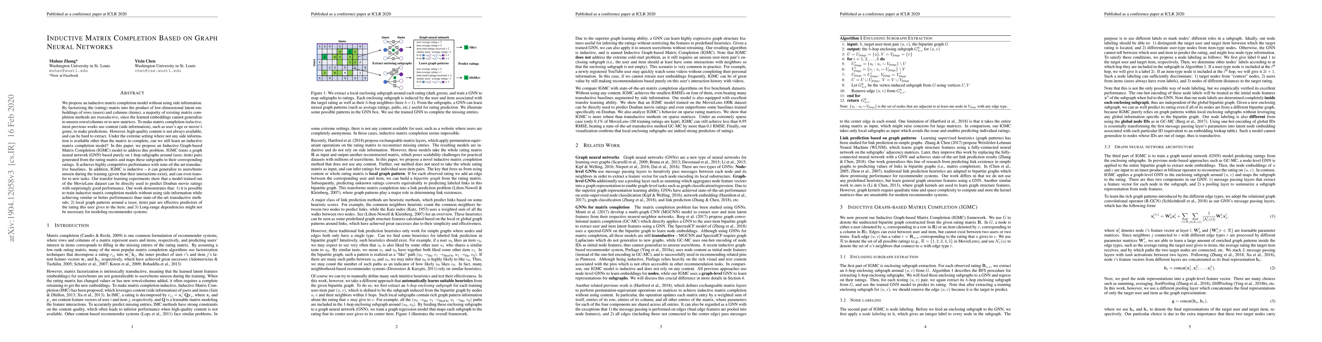 This paper proposes an Inductive Graph-based Matrix Completion (IGMC) model that uses graph neural networks to complete matrices without relying on side information. IGMC leverages local graph patterns around user-item pairs to predict ratings, achieving competitive performance and demonstrating inductive generalization to unseen users/items and transfer to new tasks.