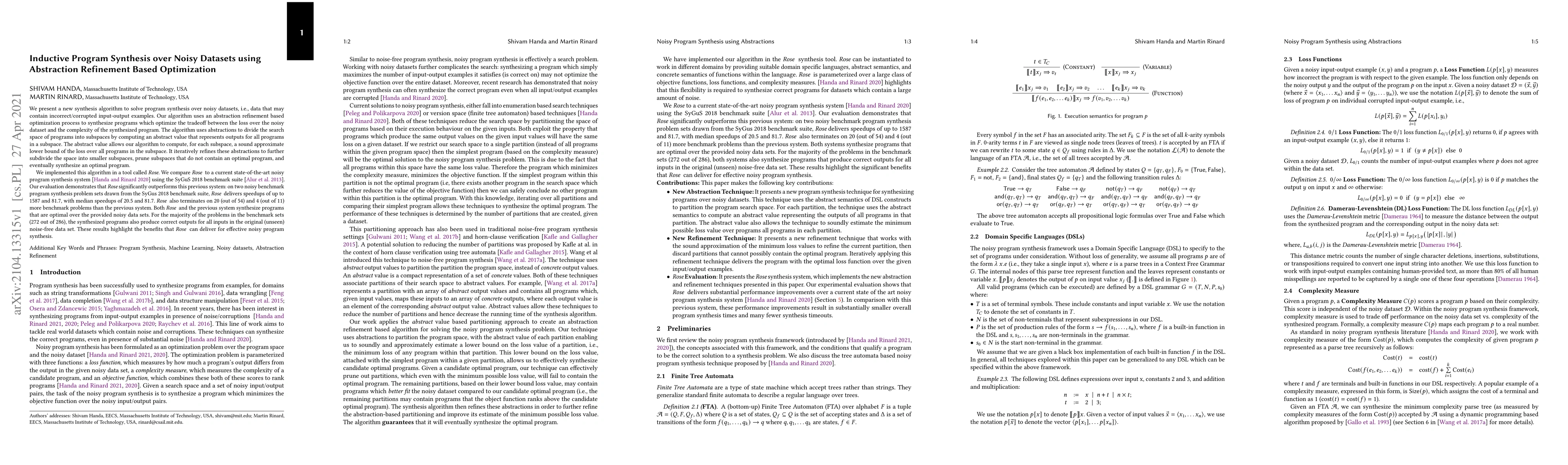This paper introduces a new program synthesis algorithm, Rose, designed for noisy datasets, employing abstraction refinement optimization to balance loss and program complexity. Rose significantly outperforms existing methods in speed and synthesis success rates on the SyGuS 2018 benchmark suite.