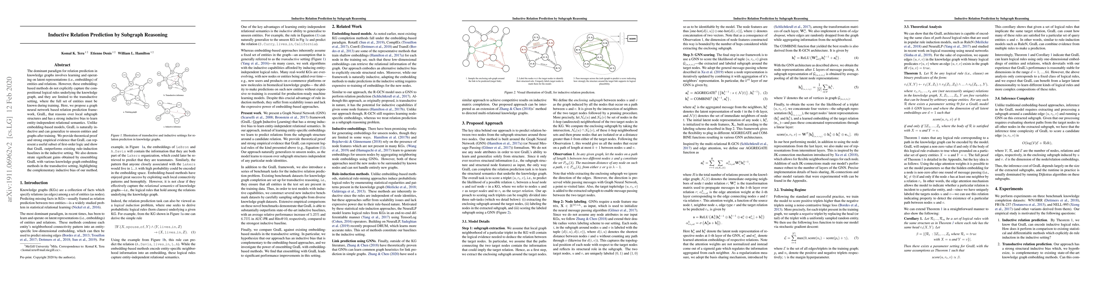 This paper proposes GraIL, a graph neural network framework for inductive relation prediction in knowledge graphs, which reasons over local subgraph structures to capture compositional logical rules. Unlike embedding-based methods, GraIL is inductive, generalizing to unseen entities, and outperforms rule-induction baselines while also enhancing transductive performance when ensembled with embedding methods.