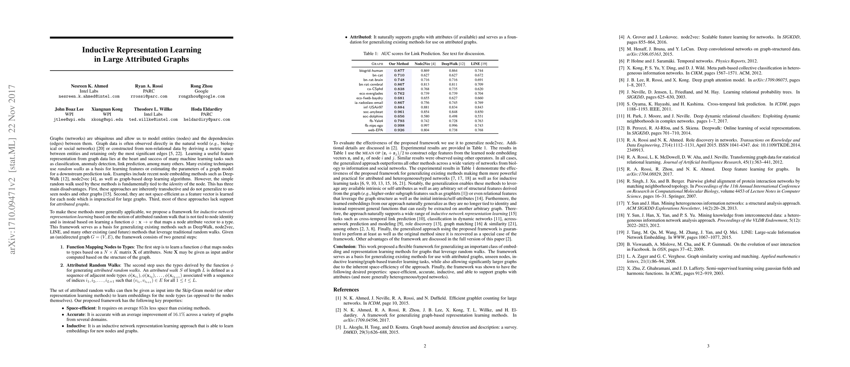 This paper proposes an inductive framework for learning feature representations from large attributed graphs, addressing the limitations of existing node embedding methods that rely on random walks. The new approach uses an attributed random walk and a mapping function to generalize to unseen nodes and graphs, improve space efficiency, and support attributed graphs.