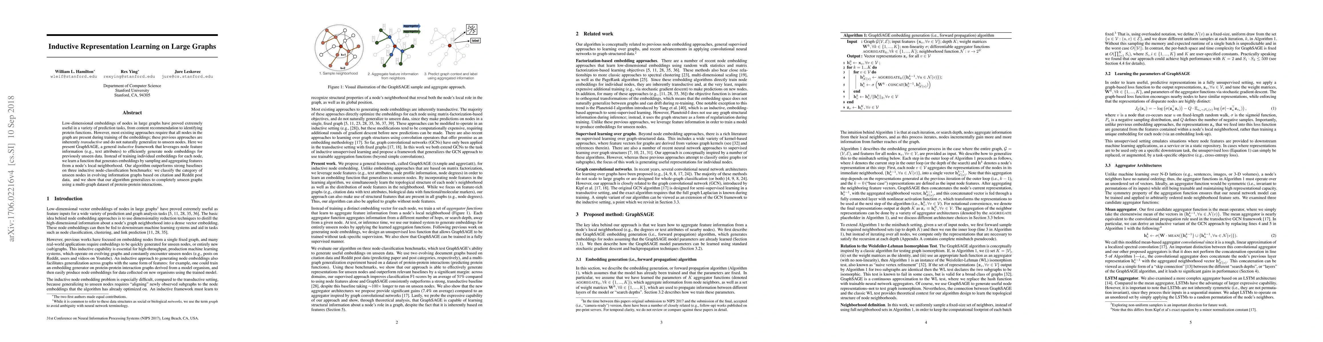 Low-dimensional embeddings of nodes in large graphs have proved extremely useful in a variety of prediction tasks, from content recommendation to identifying protein functions. However, most existing approaches require that all nodes in the graph are present during training of the embeddings; these previous approaches are inherently transductive and do not naturally generalize to unseen nodes. Here we present GraphSAGE, a general, inductive framework that leverages node feature information (e.g., text attributes) to efficiently generate node embeddings for previously unseen data. Instead of training individual embeddings for each node, we learn a function that generates embeddings by sampling and aggregating features from a node's local neighborhood. Our algorithm outperforms strong baselines on three inductive node-classification benchmarks: we classify the category of unseen nodes in evolving information graphs based on citation and Reddit post data, and we show that our algorithm generalizes to completely unseen graphs using a multi-graph dataset of protein-protein interactions.