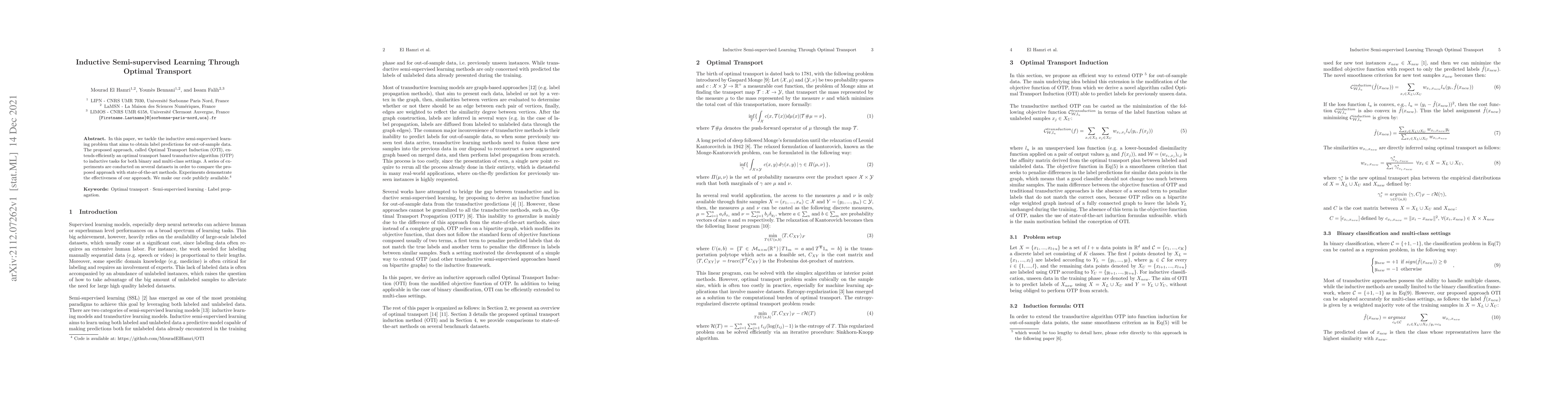 This paper introduces Optimal Transport Induction (OTI), an extension of optimal transport-based transductive learning for inductive semi-supervised learning tasks. Experiments on various datasets show that OTI outperforms state-of-the-art methods, and the code is publicly available.