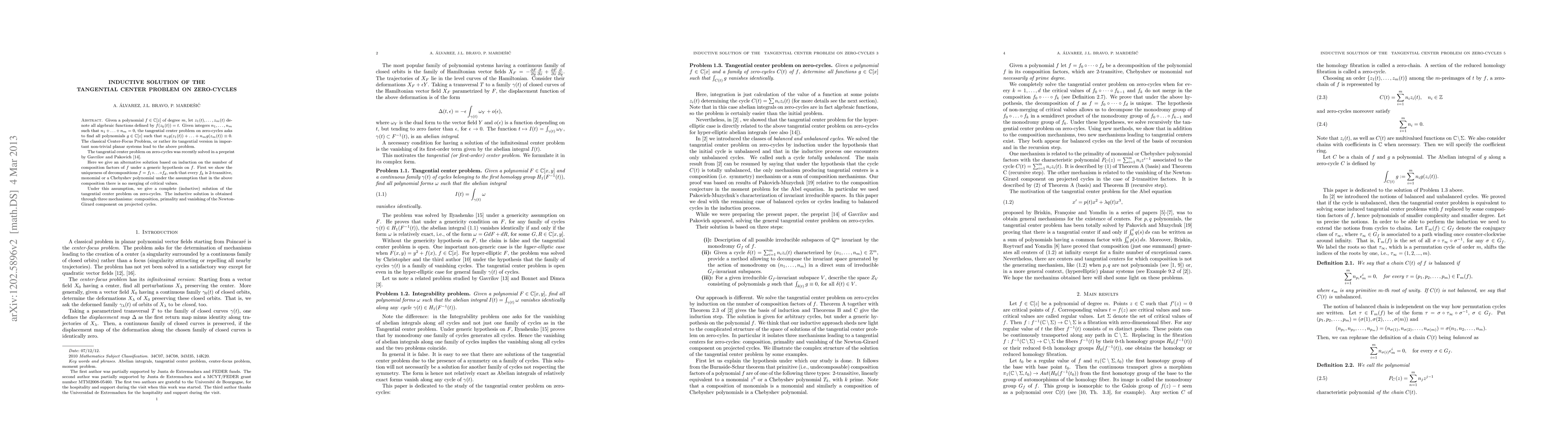 This paper presents an inductive solution to the tangential center problem on zero-cycles for polynomials defined by a given polynomial $f$. It provides an alternative method based on induction on the number of composition factors of $f$, ensuring uniqueness of decompositions and offering a complete solution through composition, primality, and vanishing of the Newton-Girard component.