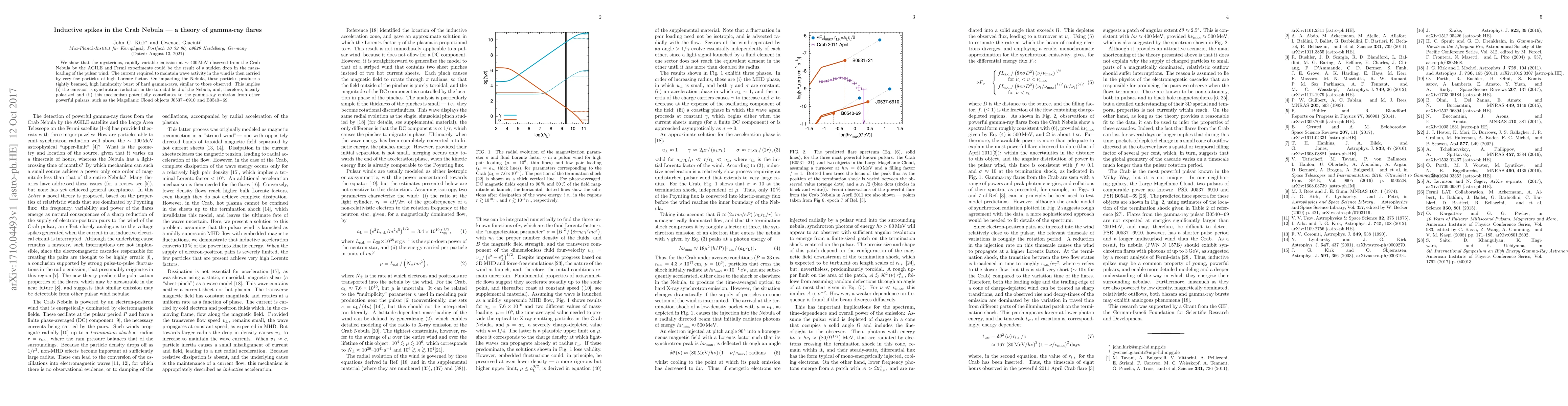We show that the mysterious, rapidly variable emission at ~400 MeV observed from the Crab Nebula by the AGILE and Fermi experiments could be the result of a sudden drop in the mass-loading of the pulsar wind. The current required to maintain wave activity in the wind is then carried by very few particles of high Lorentz factor. On impacting the Nebula, these particles produce a tightly beamed, high luminosity burst of hard gamma-rays, similar to those observed. This implies (i) the emission is synchrotron radiation in the toroidal field of the Nebula, and, therefore, linearly polarized and (ii) this mechanism potentially contributes to the gamma-ray emission from other powerful pulsars, such as the Magellanic Cloud objects J0537-6910 and B0540-69.