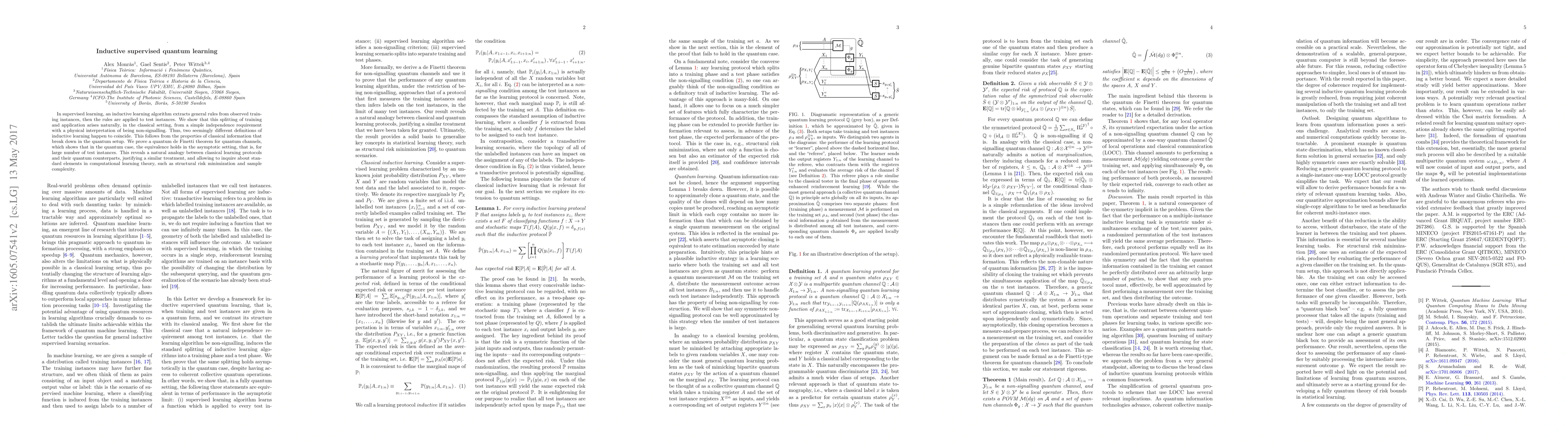 In supervised learning, an inductive learning algorithm extracts general rules from observed training instances, then the rules are applied to test instances. We show that this splitting of training and application arises naturally, in the classical setting, from a simple independence requirement with a physical interpretation of being non-signalling. Thus, two seemingly different definitions of inductive learning happen to coincide. This follows from the properties of classical information that break down in the quantum setup. We prove a quantum de Finetti theorem for quantum channels, which shows that in the quantum case, the equivalence holds in the asymptotic setting, that is, for large number of test instances. This reveals a natural analogy between classical learning protocols and their quantum counterparts, justifying a similar treatment, and allowing to inquire about standard elements in computational learning theory, such as structural risk minimization and sample complexity.