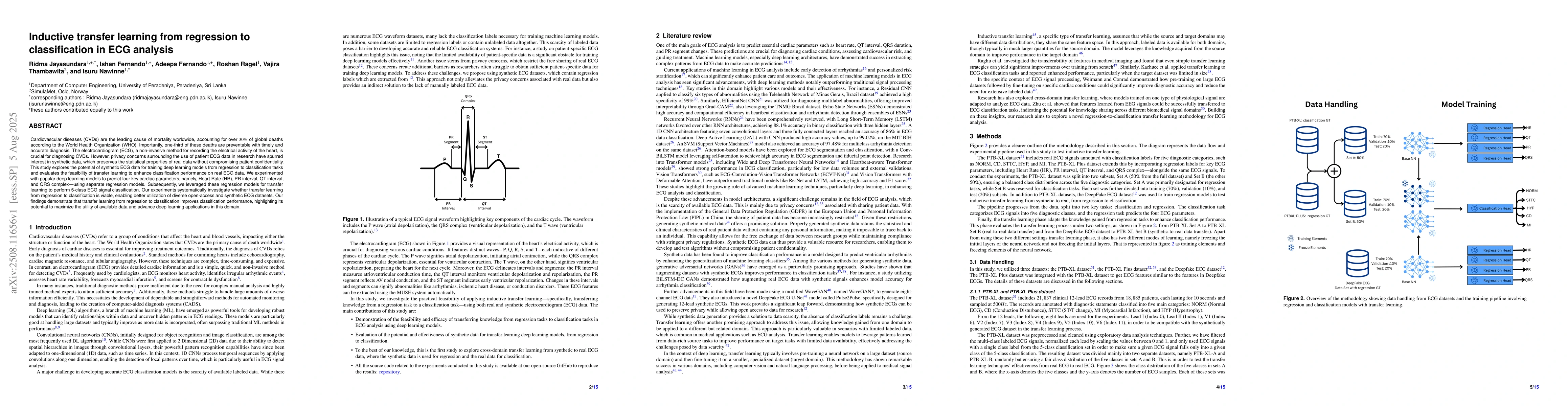 Cardiovascular diseases (CVDs) are the leading cause of mortality worldwide, accounting for over 30% of global deaths according to the World Health Organization (WHO). Importantly, one-third of these deaths are preventable with timely and accurate diagnosis. The electrocardiogram (ECG), a non-invasive method for recording the electrical activity of the heart, is crucial for diagnosing CVDs. However, privacy concerns surrounding the use of patient ECG data in research have spurred interest in synthetic data, which preserves the statistical properties of real data without compromising patient confidentiality. This study explores the potential of synthetic ECG data for training deep learning models from regression to classification tasks and evaluates the feasibility of transfer learning to enhance classification performance on real ECG data. We experimented with popular deep learning models to predict four key cardiac parameters, namely, Heart Rate (HR), PR interval, QT interval, and QRS complex-using separate regression models. Subsequently, we leveraged these regression models for transfer learning to perform 5-class ECG signal classification. Our experiments systematically investigate whether transfer learning from regression to classification is viable, enabling better utilization of diverse open-access and synthetic ECG datasets. Our findings demonstrate that transfer learning from regression to classification improves classification performance, highlighting its potential to maximize the utility of available data and advance deep learning applications in this domain.
