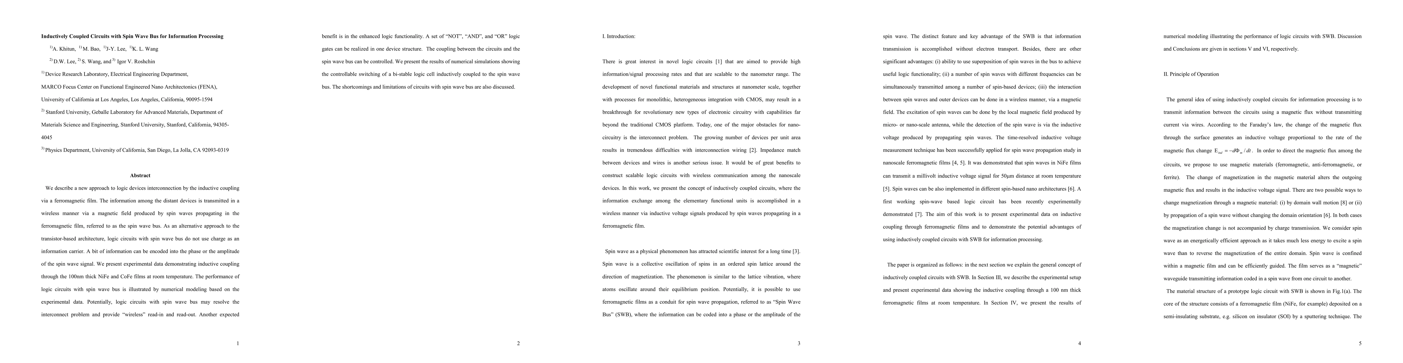 This paper proposes a novel logic device interconnection method using inductive coupling through a ferromagnetic film, where spin waves serve as a "spin wave bus" for wireless information transmission. The approach eliminates the need for charge-based information carriers and demonstrates experimental and numerical evidence of its feasibility, suggesting potential benefits like enhanced logic functionality and wireless read-in/read-out capabilities.