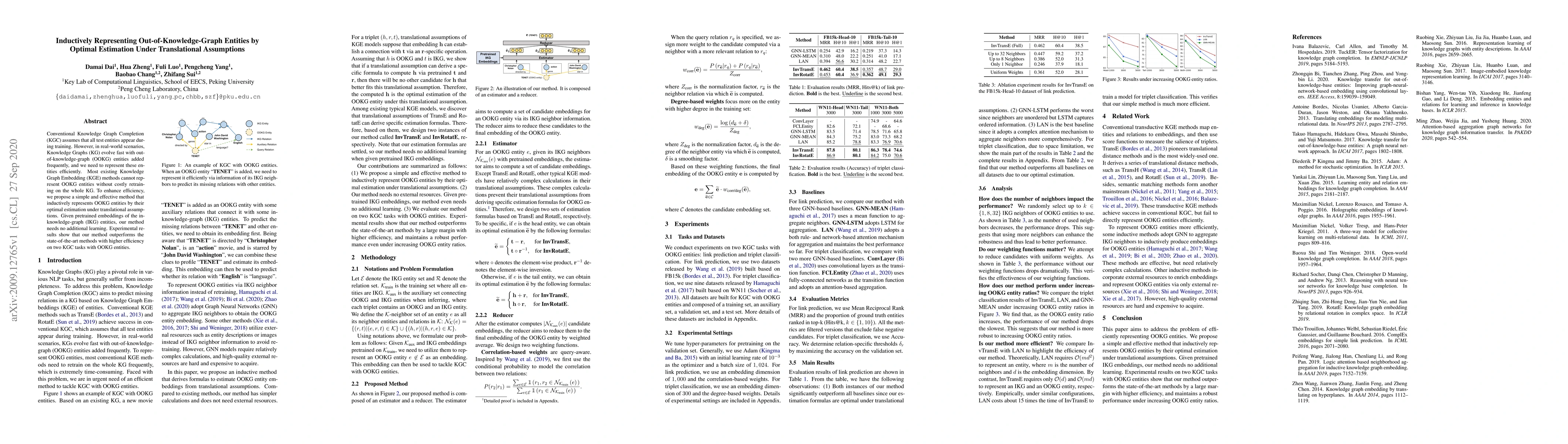 This paper proposes an efficient method for representing out-of-knowledge-graph (OOKG) entities in Knowledge Graph Completion (KGC) without retraining the entire graph. The method leverages optimal estimation under translational assumptions, achieving better performance and efficiency compared to state-of-the-art methods.