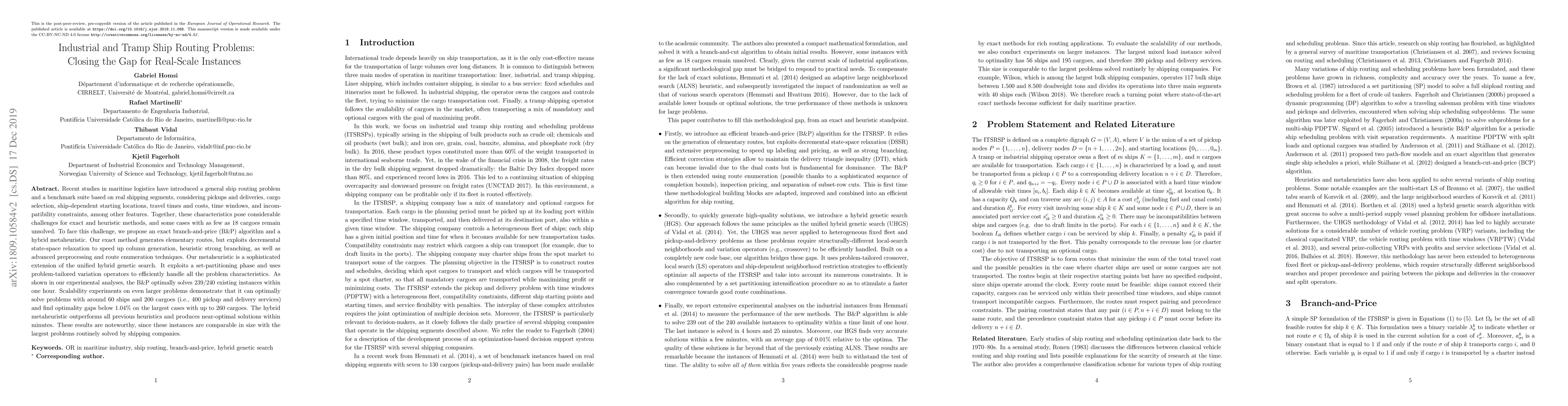 This paper proposes an exact branch-and-price algorithm and a hybrid metaheuristic to tackle complex ship routing problems in maritime logistics, featuring real-scale instances with numerous cargoes, time windows, and constraints. The exact method optimally solves most existing instances and can handle problems with up to 60 ships and 200 cargoes.