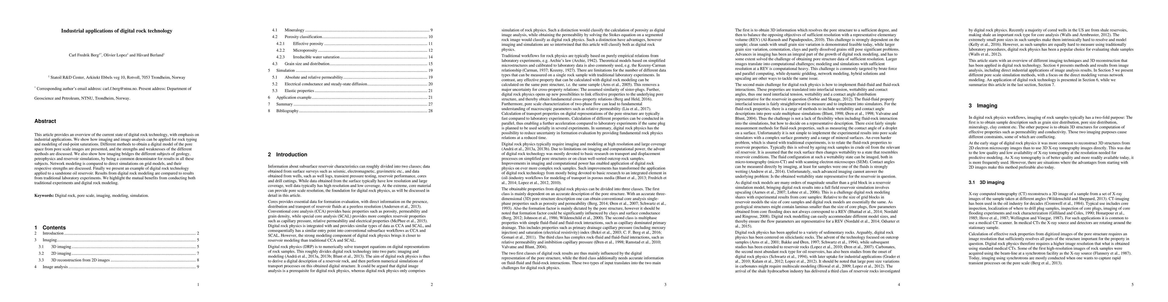 This paper reviews digital rock technology's industrial applications, emphasizing rock typing and saturation modeling. It discusses various methods for creating digital pore space models and compares network modeling with direct grid simulations, highlighting their respective strengths. An example application in a sandstone oil reservoir demonstrates the benefits of combining traditional experiments with digital rock modeling.