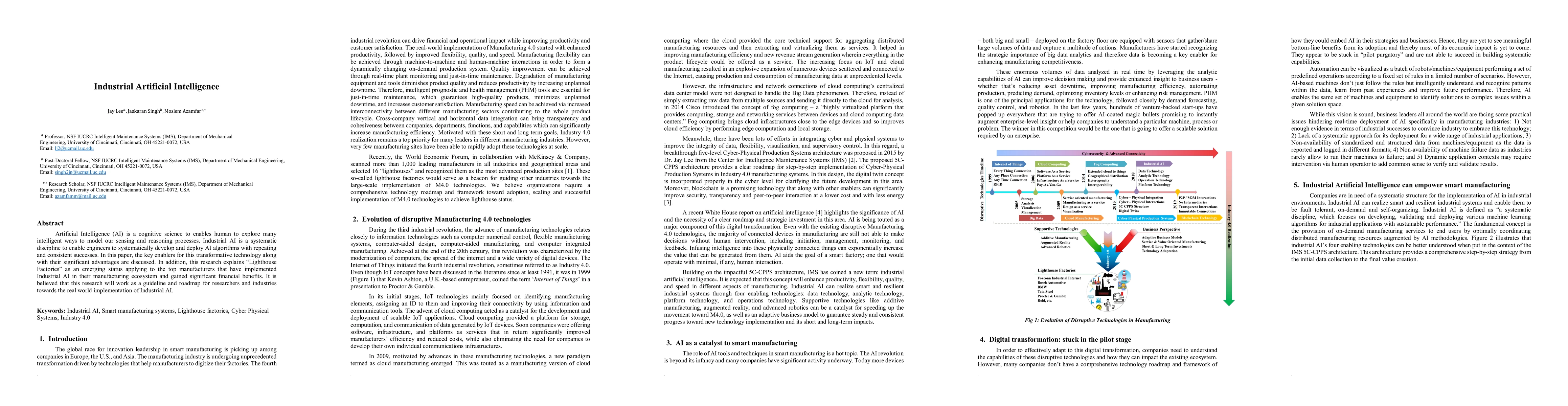 Artificial Intelligence (AI) is a cognitive science to enables human to explore many intelligent ways to model our sensing and reasoning processes. Industrial AI is a systematic discipline to enable engineers to systematically develop and deploy AI algorithms with repeating and consistent successes. In this paper, the key enablers for this transformative technology along with their significant advantages are discussed. In addition, this research explains Lighthouse Factories as an emerging status applying to the top manufacturers that have implemented Industrial AI in their manufacturing ecosystem and gained significant financial benefits. It is believed that this research will work as a guideline and roadmap for researchers and industries towards the real-world implementation of Industrial AI.