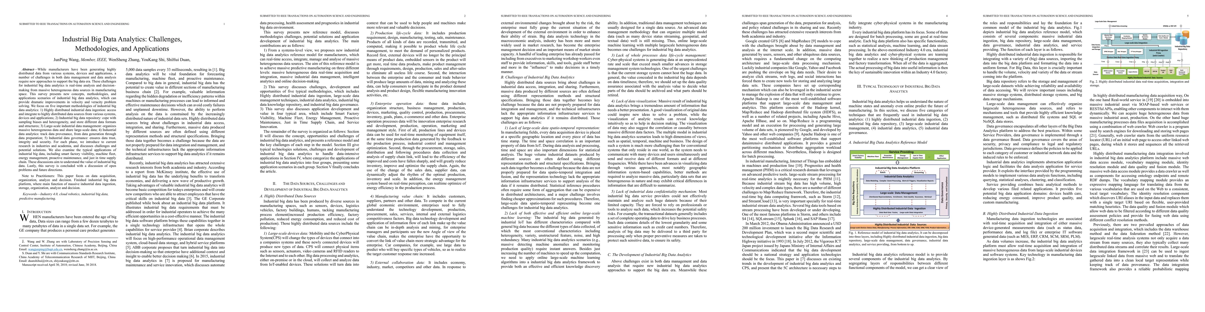 This paper surveys the challenges, methodologies, and applications of industrial big data analytics, focusing on five key areas: data ingestion, data repository, data management, data analytics, and data governance. It discusses current research and potential solutions for managing and analyzing massive heterogeneous data in manufacturing, highlighting applications like smart factories and supply chain optimization.