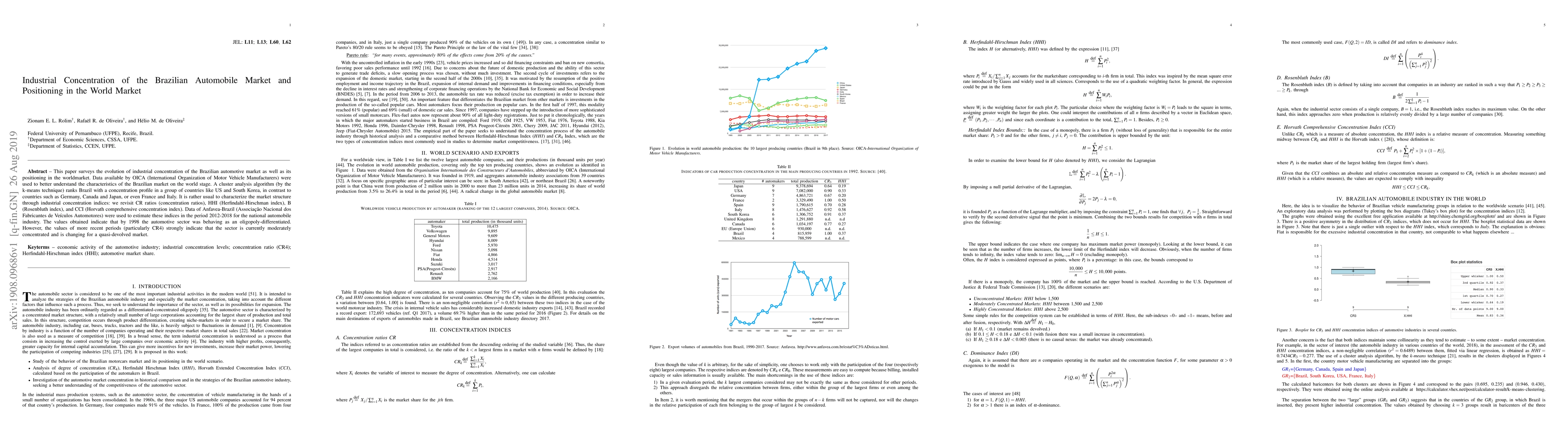 This paper analyzes the industrial concentration of Brazil's automotive market and its global positioning using OICA and Anfavea data from 2012-2018. The k-means cluster analysis ranks Brazil's market concentration similarly to the US and South Korea, indicating a shift from an oligopoly-differentiated structure to a moderately concentrated quasi-devolved market.