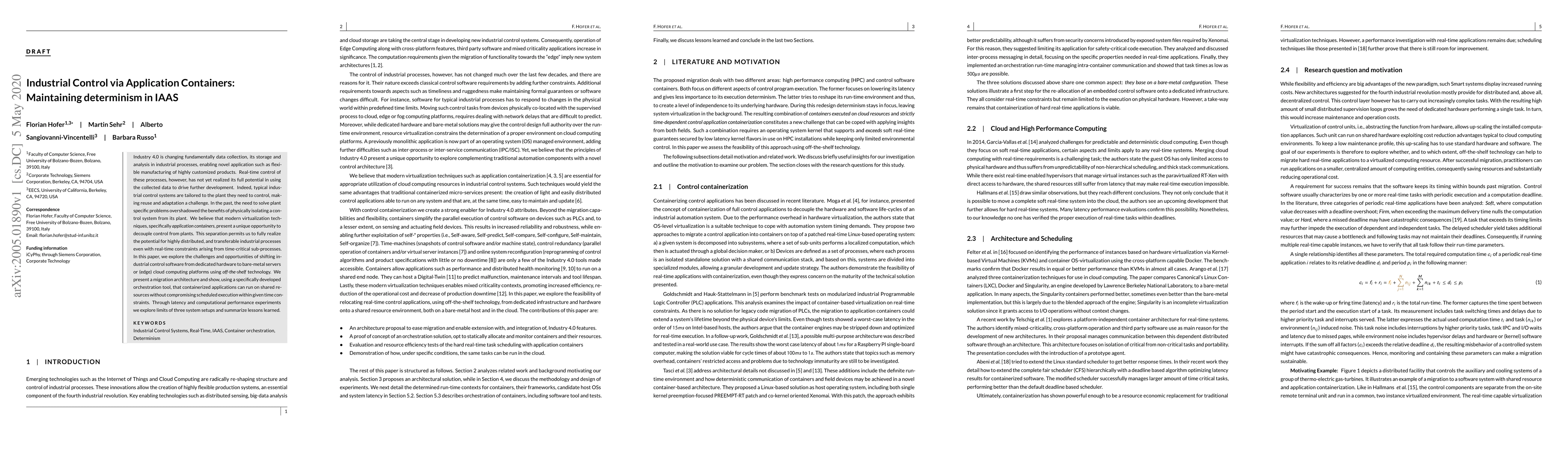 This paper investigates the transition of industrial control systems from dedicated hardware to application containers on IAAS platforms, aiming to maintain determinism and real-time performance. It presents a migration architecture and demonstrates that containerized applications can operate on shared resources without compromising scheduled execution, supported by experiments on latency and computational performance.