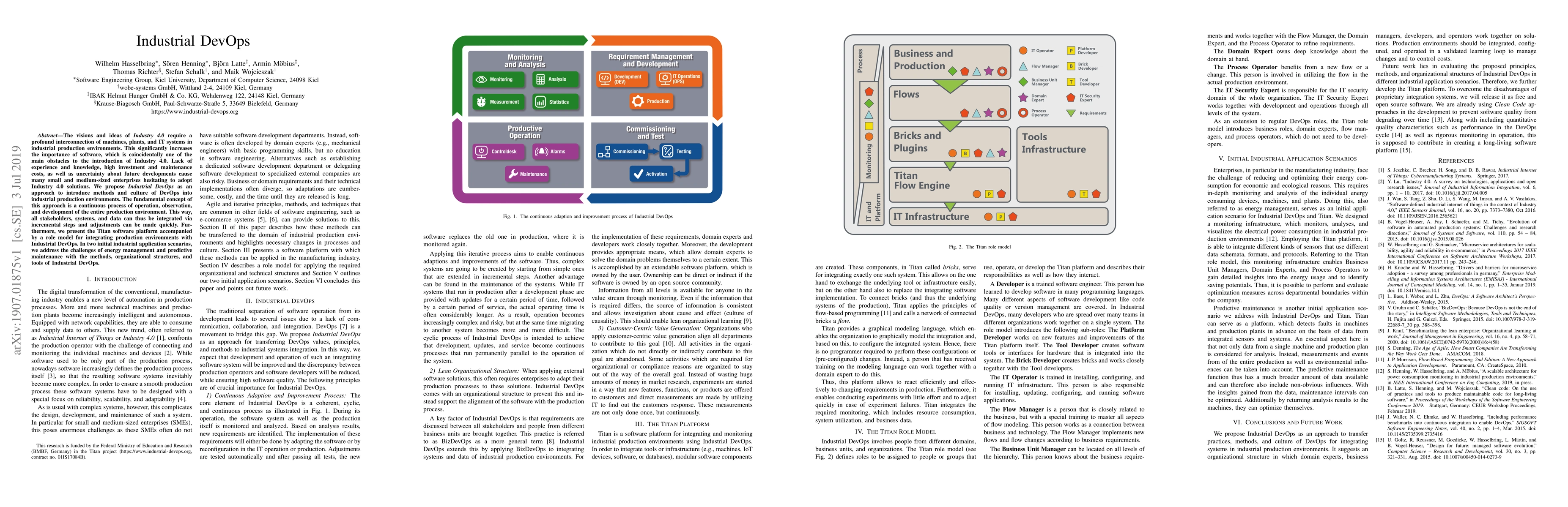 Industrial DevOps aims to integrate DevOps methods into industrial production environments to overcome the challenges of adopting Industry 4.0, focusing on continuous operation, observation, and development. The Titan software platform and role model demonstrate its application in energy management and predictive maintenance scenarios.