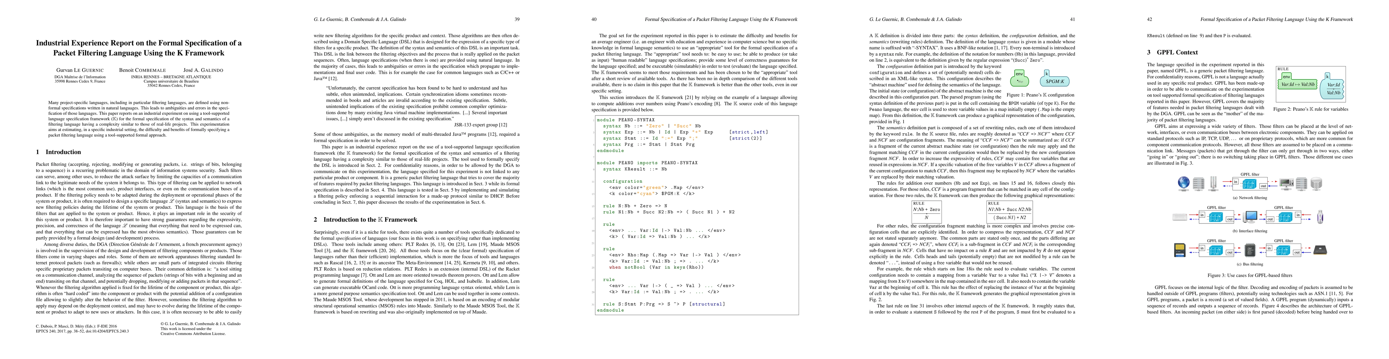 This paper reports on an industrial experiment using the K Framework to formally specify the syntax and semantics of a packet filtering language, aiming to assess the challenges and benefits of this approach in a real-world setting. The study highlights the reduction in ambiguities and errors compared to traditional natural language specifications.