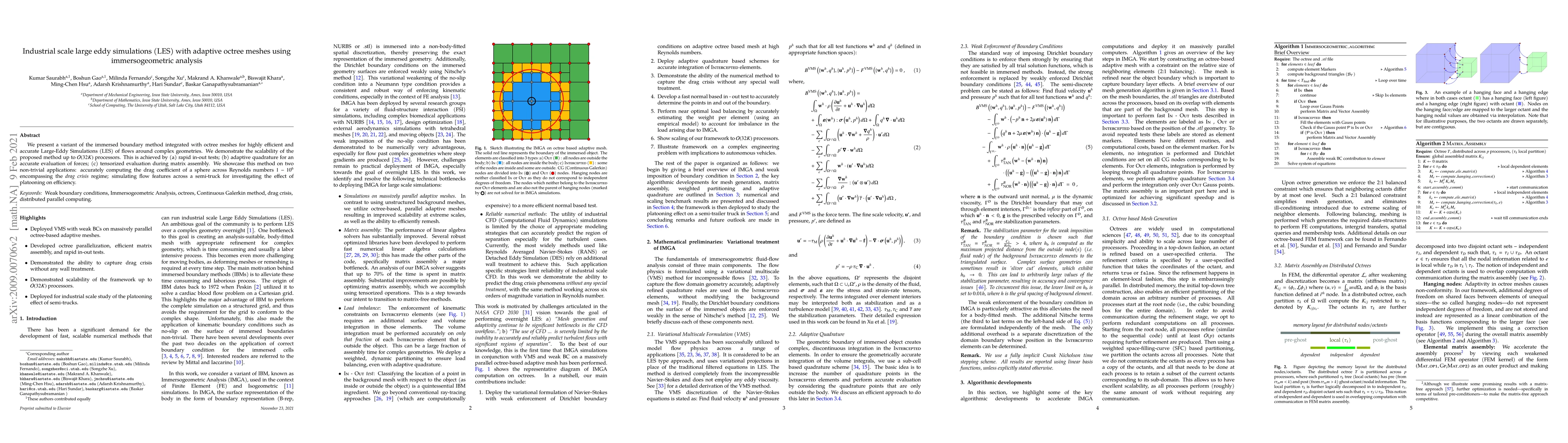 This paper introduces an efficient immersed boundary method with adaptive octree meshes for Large-Eddy Simulations (LES) of complex fluid flows, demonstrating scalability up to 32K processors. The method is validated through accurate drag coefficient calculations for spheres and flow simulations around semi-trucks to study platooning effects.