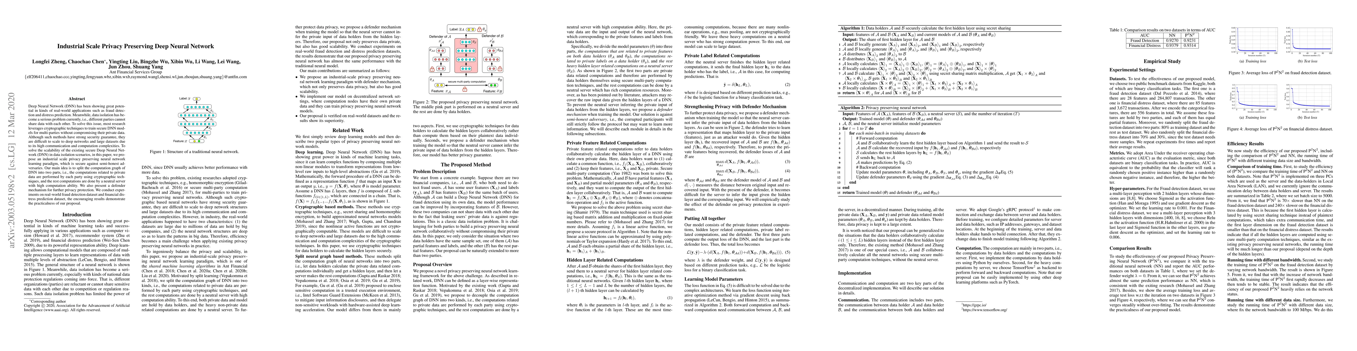 This paper proposes an industrial-scale privacy-preserving deep neural network learning paradigm to address the scalability issues of secure DNNs in data isolation scenarios. The approach splits the computation graph, allowing private data computations by parties and general computations by a neutral server, with a defender mechanism for enhanced privacy. Experiments on real-world datasets show promising results.