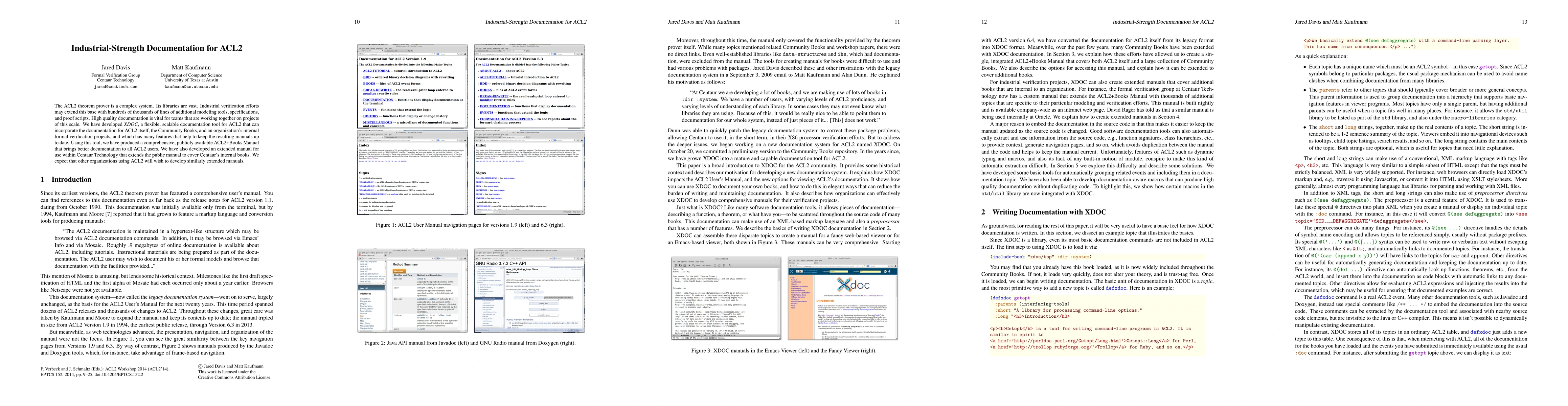 The paper introduces XDOC, a scalable documentation tool for ACL2 that integrates documentation from ACL2 libraries, Community Books, and internal projects, facilitating collaborative verification efforts. The tool has produced a comprehensive ACL2+Books Manual, enhancing documentation for all ACL2 users, with an extended version tailored for Centaur Technology.