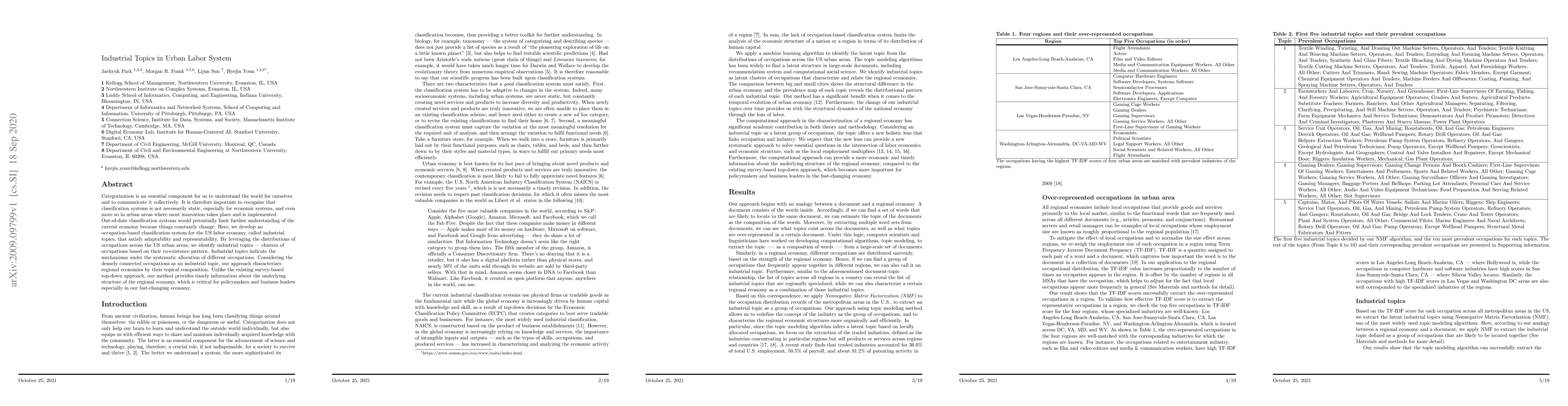Categorization is an essential component for us to understand the world for ourselves and to communicate it collectively. It is therefore important to recognize that classification system are not necessarily static, especially for economic systems, and even more so in urban areas where most innovation takes place and is implemented. Out-of-date classification systems would potentially limit further understanding of the current economy because things constantly change. Here, we develop an occupation-based classification system for the US labor economy, called industrial topics, that satisfy adaptability and representability. By leveraging the distributions of occupations across the US urban areas, we identify industrial topics - clusters of occupations based on their co-existence pattern. Industrial topics indicate the mechanisms under the systematic allocation of different occupations. Considering the densely connected occupations as an industrial topic, our approach characterizes regional economies by their topical composition. Unlike the existing survey-based top-down approach, our method provides timely information about the underlying structure of the regional economy, which is critical for policymakers and business leaders, especially in our fast-changing economy.
