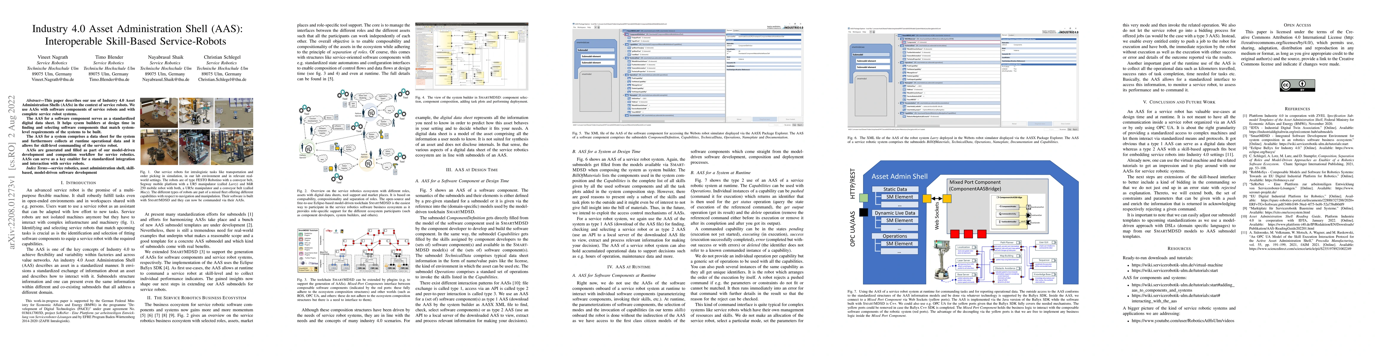 This paper explores the use of Industry 4.0 Asset Administration Shells (AASs) to standardize service robot components and systems, facilitating their integration and interaction. AASs act as digital data sheets for software components and entire systems, aiding in design and runtime operational data collection, enabling skill-based robot command.