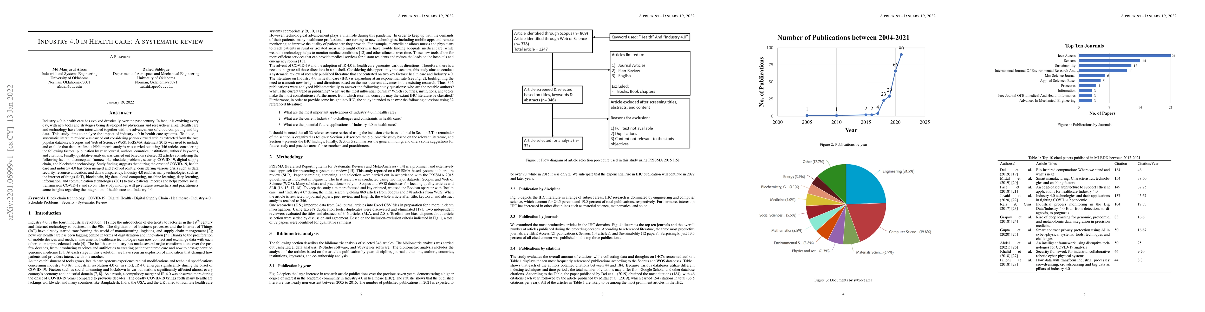 Industry 4.0 in health care has evolved drastically over the past century. In fact, it is evolving every day, with new tools and strategies being developed by physicians and researchers alike. Health care and technology have been intertwined together with the advancement of cloud computing and big data. This study aims to analyze the impact of industry 4.0 in health care systems. To do so, a systematic literature review was carried out considering peer-reviewed articles extracted from the two popular databases: Scopus and Web of Science (WoS). PRISMA statement 2015 was used to include and exclude that data. At first, a bibliometric analysis was carried out using 346 articles considering the following factors: publication by year, journal, authors, countries, institutions, authors' keywords, and citations. Finally, qualitative analysis was carried out based on selected 32 articles considering the following factors: a conceptual framework, schedule problems, security, COVID-19, digital supply chain, and blockchain technology. Study finding suggests that during the onset of COVID-19, health care and industry 4.0 has been merged and evolved jointly, considering various crisis such as data security, resource allocation, and data transparency. Industry 4.0 enables many technologies such as the internet of things (IoT), blockchain, big data, cloud computing, machine learning, deep learning, information, and communication technologies (ICT) to track patients' records and helps reduce social transmission COVID-19 and so on. The study findings will give future researchers and practitioners some insights regarding the integration of health care and Industry 4.0.