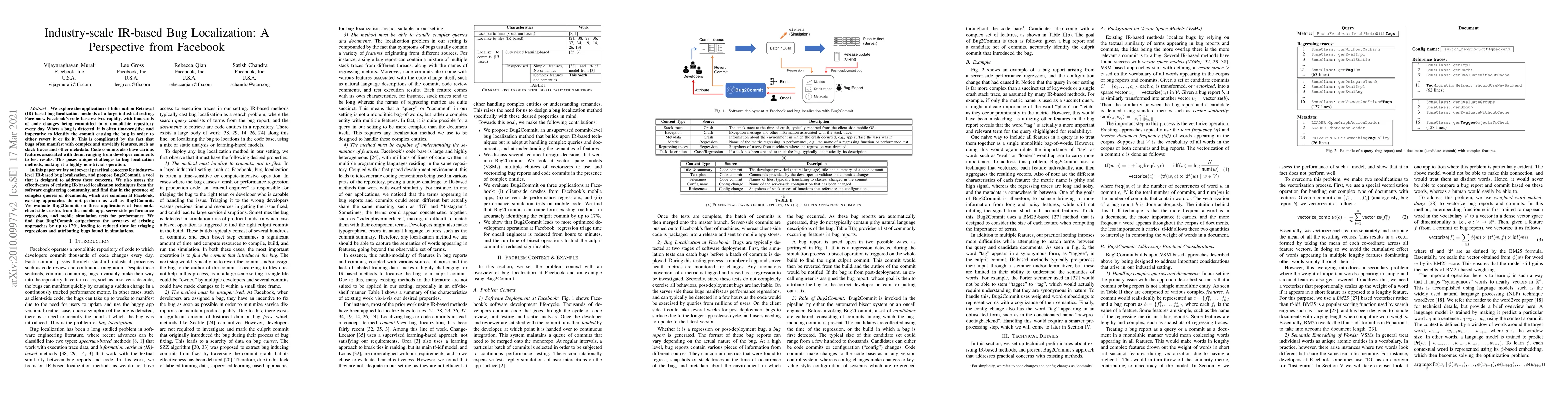 This paper investigates the application of IR-based bug localization in Facebook's rapidly evolving codebase, proposing Bug2Commit to address unique challenges. The study finds that Bug2Commit outperforms existing methods by up to 17% in accuracy, significantly aiding in triaging regressions and attributing bugs.