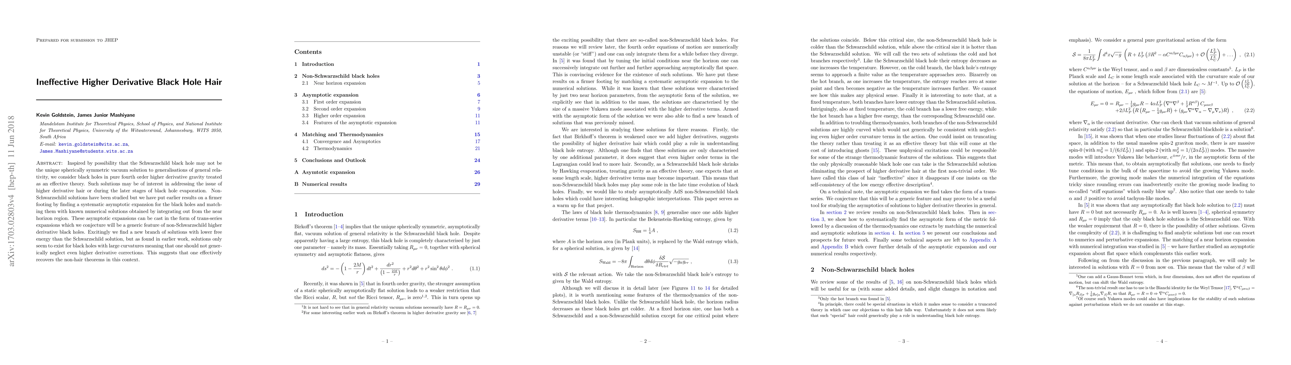 Inspired by possibility that the Schwarzschild black hole may not be the unique spherically symmetric vacuum solution to generalisations of general relativity, we consider black holes in pure fourth order higher derivative gravity treated as an effective theory. Such solutions may be of interest in addressing the issue of higher derivative hair or during the later stages of black hole evaporation. Non-Schwarzschild solutions have been studied but we have put earlier results on a firmer footing by finding a systematic asymptotic expansion for the black holes and matching them with known numerical solutions obtained by integrating out from the near horizon region. These asymptotic expansions can be cast in the form of trans-series expansions which we conjecture will be a generic feature of non-Schwarzschild higher derivative black holes. Excitingly we find a new branch of solutions with lower free energy than the Schwarzschild solution, but as found in earlier work, solutions only seem to exist for black holes with large curvatures meaning that one should not generically neglect even higher derivative corrections. This suggests that one effectively recovers the non-hair theorems in this context.