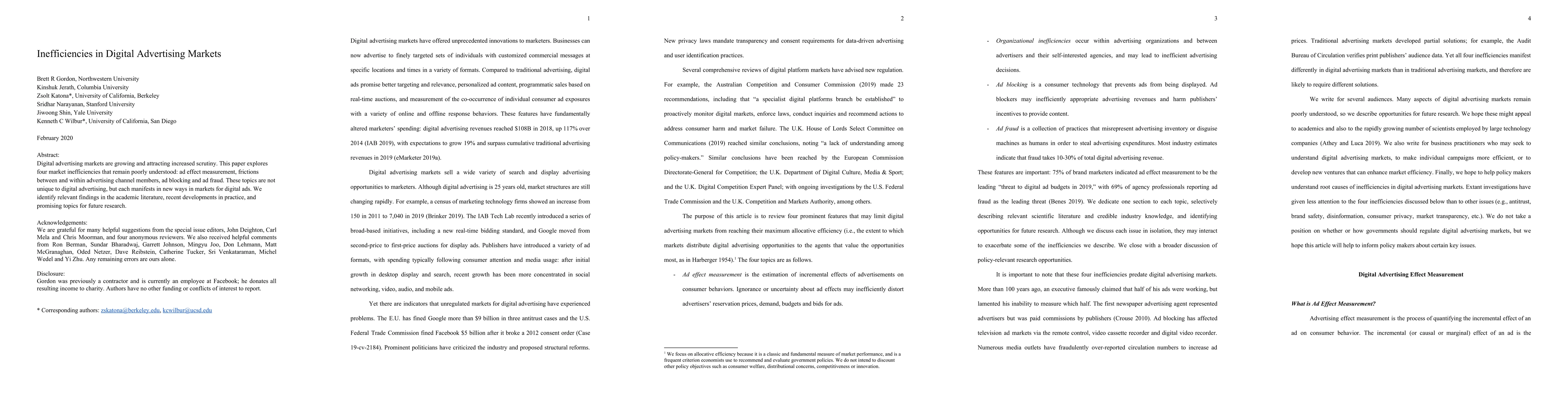 This paper investigates four key inefficiencies in digital advertising markets: ad effect measurement, frictions among advertising channel members, ad blocking, and ad fraud. It highlights academic findings, recent industry developments, and suggests avenues for future research.