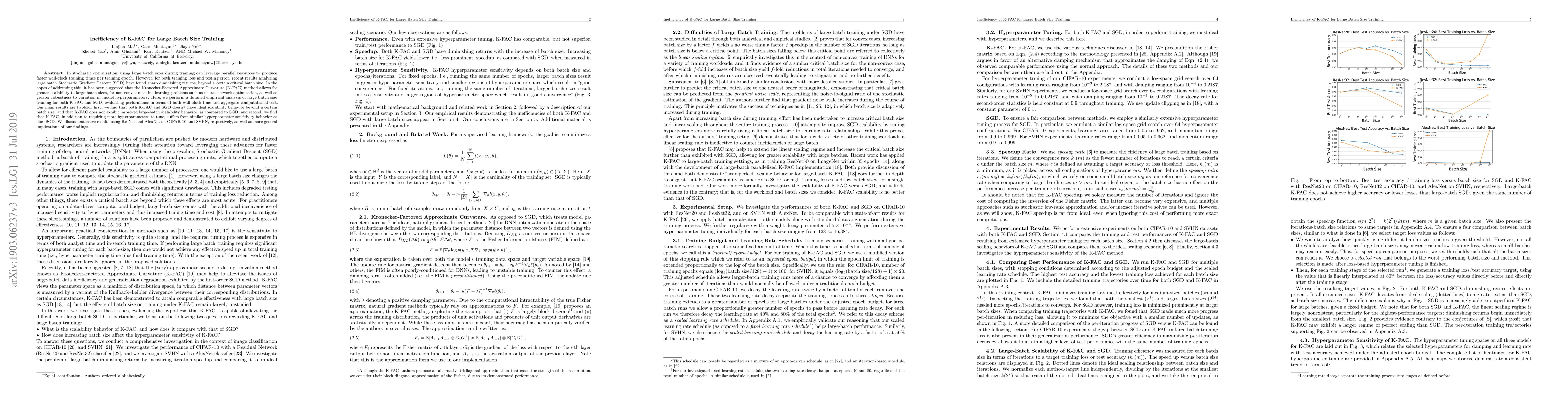This paper investigates the scalability of the Kronecker-Factored Approximate Curvature (K-FAC) method for large batch size training, finding no significant improvement over Stochastic Gradient Descent (SGD). Both methods show diminishing returns beyond a critical batch size, and K-FAC requires more hyperparameter tuning with similar sensitivity issues as SGD.