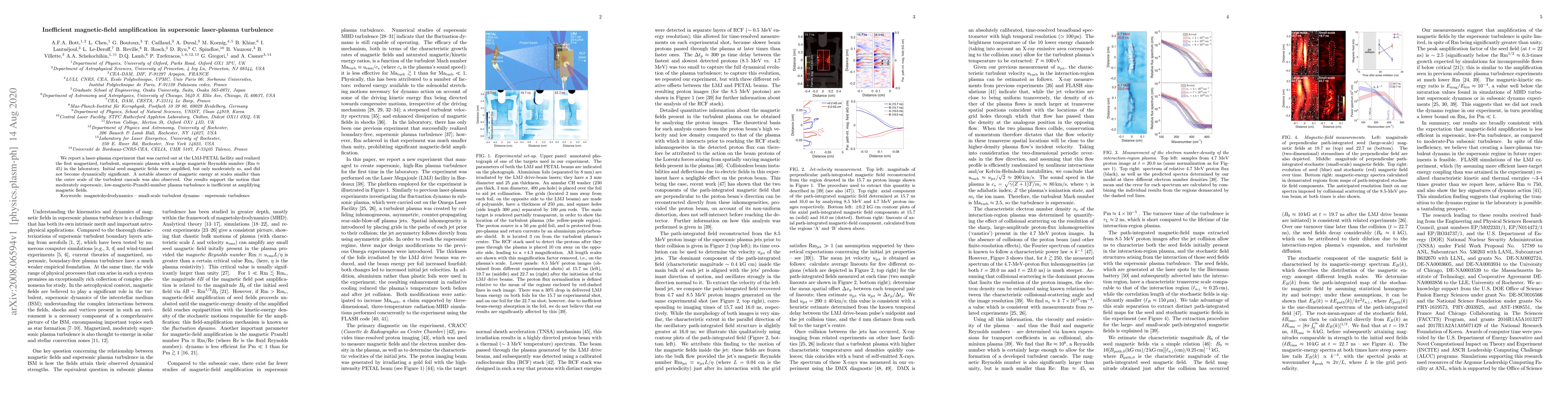 This paper reports on a laser-plasma experiment at the LMJ-PETAL facility that created a highly turbulent, magnetized, supersonic plasma. Despite initial seed magnetic fields being amplified, they remained insignificant, supporting the idea that such plasma turbulence is inefficient at amplifying magnetic fields.