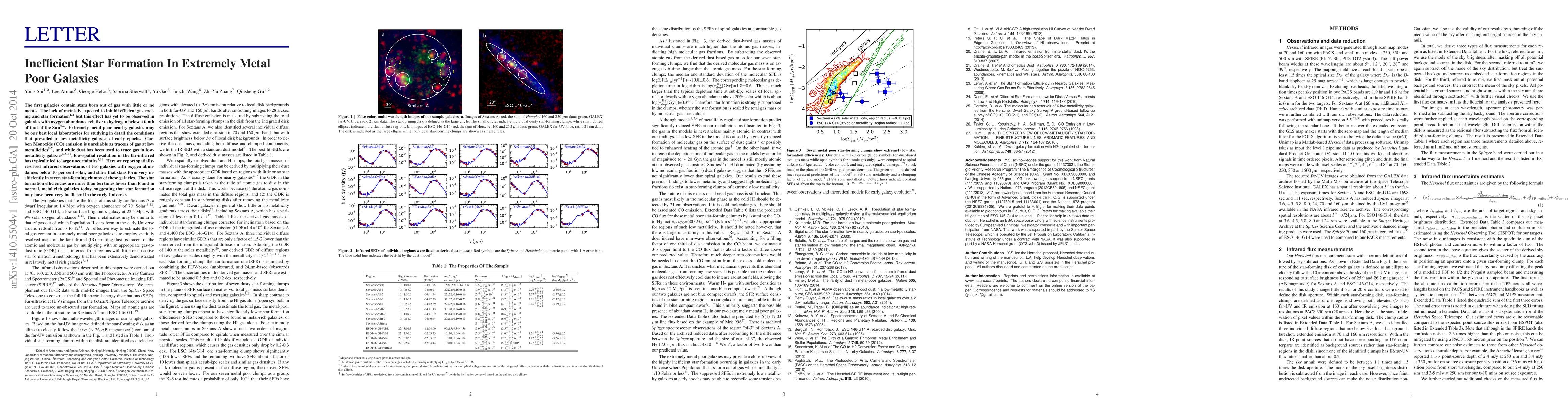 The first galaxies contain stars born out of gas with little or no metals. The lack of metals is expected to inhibit efficient gas cooling and star formation but this effect has yet to be observed in galaxies with oxygen abundance relative to hydrogen below a tenth of that of the Sun. Extremely metal poor nearby galaxies may be our best local laboratories for studying in detail the conditions that prevailed in low metallicity galaxies at early epochs. Carbon Monoxide (CO) emission is unreliable as tracers of gas at low metallicities, and while dust has been used to trace gas in low-metallicity galaxies, low-spatial resolution in the far-infrared has typically led to large uncertainties. Here we report spatially-resolved infrared observations of two galaxies with oxygen abundances below 10 per cent solar, and show that stars form very inefficiently in seven star-forming clumps of these galaxies. The star formation efficiencies are more than ten times lower than found in normal, metal rich galaxies today, suggesting that star formation may have been very inefficient in the early Universe.