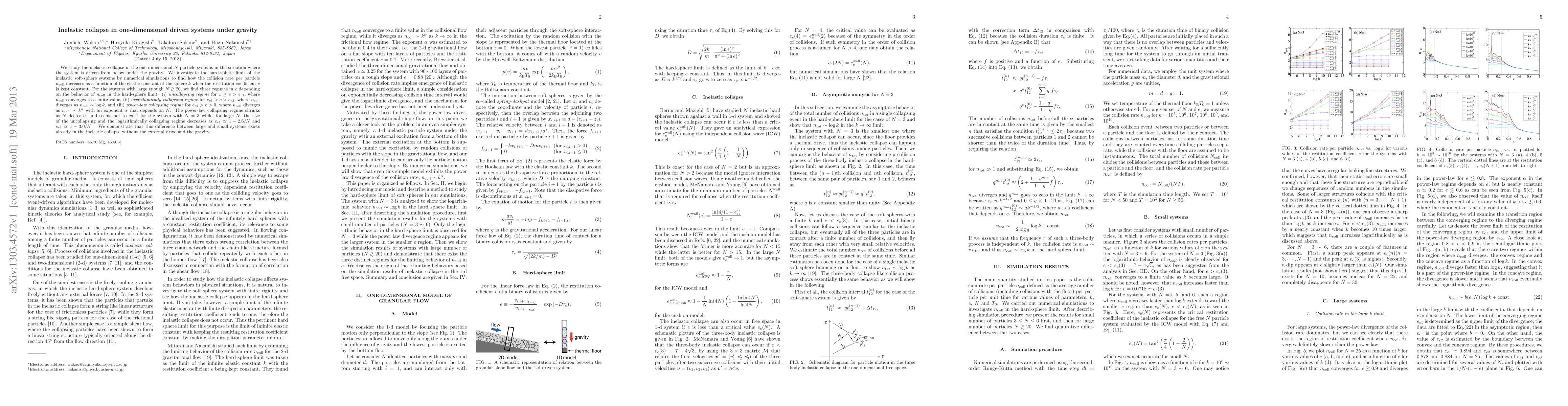 We study the inelastic collapse in the one-dimensional $N$-particle systems in the situation where the system is driven from below under the gravity. We investigate the hard-sphere limit of the inelastic soft-sphere systems by numerical simulations to find how the collision rate per particle $n_{coll}$ increases as a function of the elastic constant of the sphere $k$ when the restitution coefficient $e$ is kept constant. For the systems with large enough $N \agt 20$, we find three regimes in $e$ depending on the behavior of $n_{coll}$ in the hard-sphere limit: (i) uncollapsing regime for $1 \ge e > e_{c1}$, where $n_{coll}$ converges to a finite value, (ii) logarithmically collapsing regime for $e_{c1} > e > e_{c2}$, where $n_{coll}$ diverges as $n_{coll} \sim \log k$, and (iii) power-law collapsing regime for $e_{c2} > e > 0$, where $n_{coll}$ diverges as $n_{coll} \sim k^\alpha$ with an exponent $\alpha$ that depends on $N$. The power-law collapsing regime shrinks as $N$ decreases and seems not to exist for the system with N=3 while, for large $N$, the size of the uncollapsing and the logarithmically collapsing regime decreases as $e_{c1} \simeq 1-2.6/N$ and $e_{c2} \simeq 1-3.0/N$. We demonstrate that this difference between large and small systems exists already in the inelastic collapse without the external drive and the gravity.