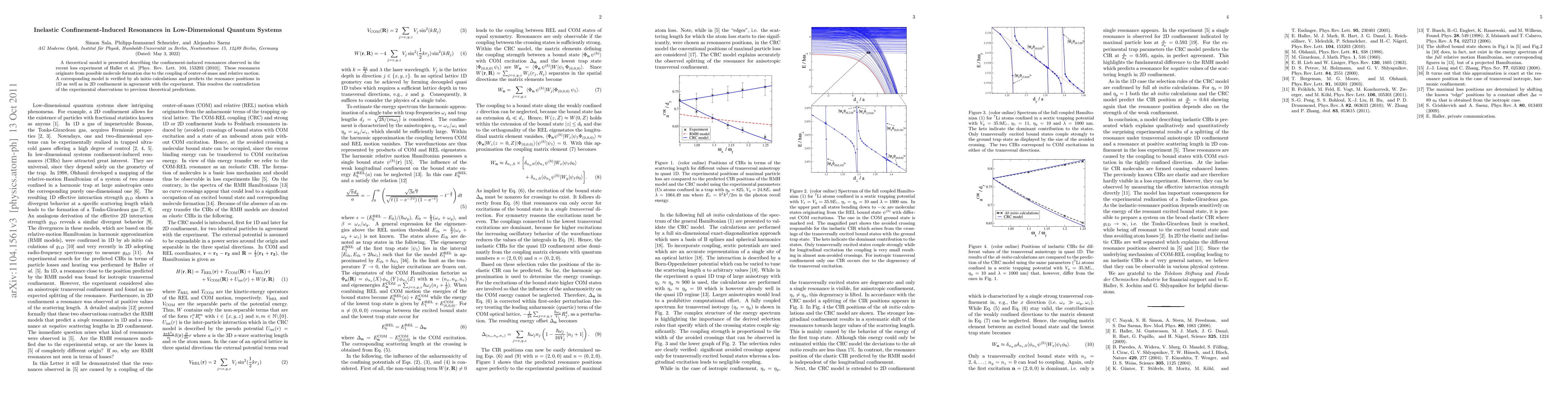 This paper presents a theoretical model explaining confinement-induced resonances in low-dimensional quantum systems, verified by ab initio calculations, which aligns with recent experimental observations by Haller et al. [Phys. Rev. Lett. 104, 153203 (2010)].
