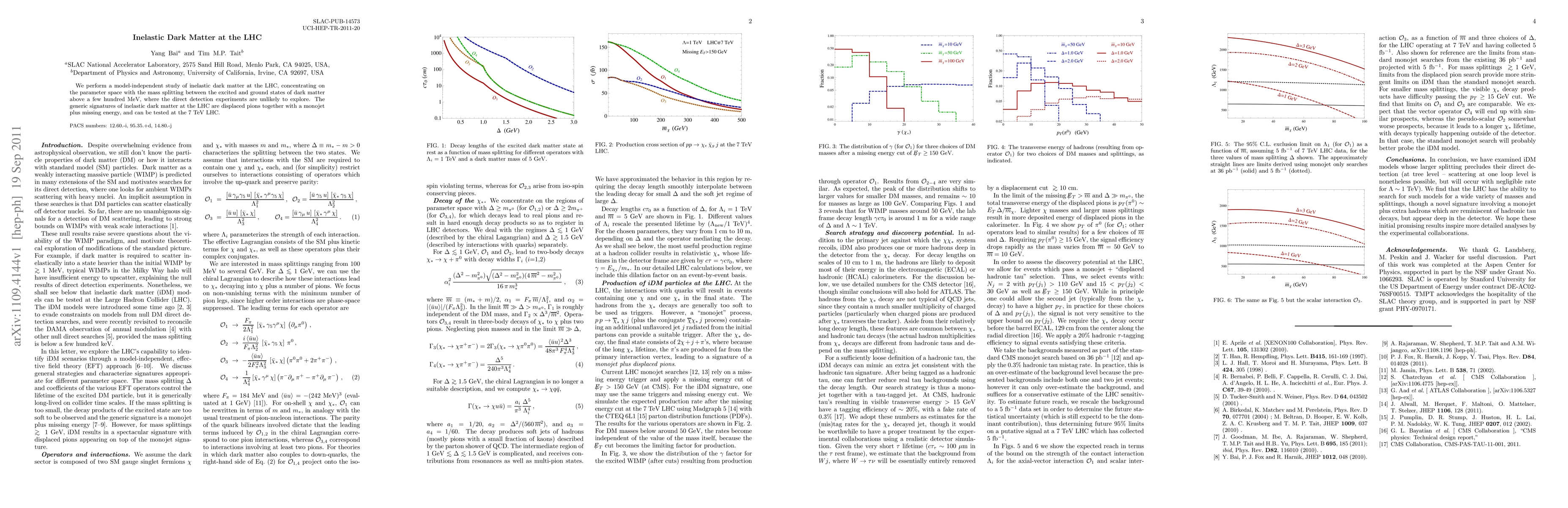 This paper explores inelastic dark matter at the LHC, focusing on scenarios where mass splitting exceeds a few hundred MeV, which evades direct detection experiments. It proposes displaced pions, a monojet, and missing energy as potential signatures for this phenomenon at the 7 TeV LHC.