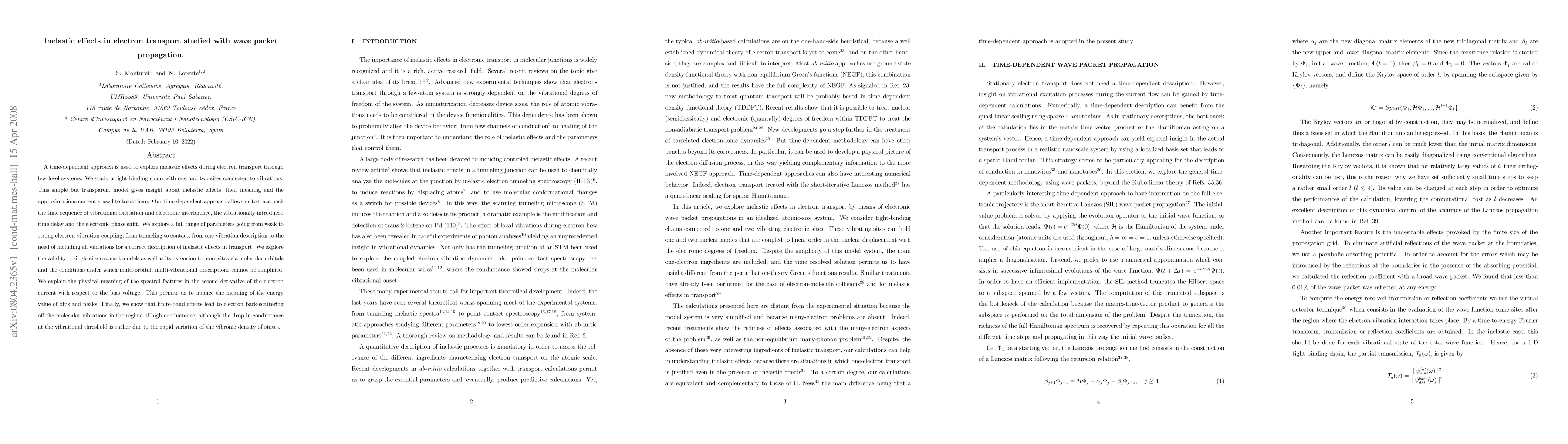 This research investigates inelastic effects in electron transport through a few-level system using a time-dependent approach and wave packet propagation. The study explores various electron-vibration coupling strengths and conditions under which single-site resonant models are valid, revealing the physical meaning behind spectral features and the influence of finite-band effects on electron scattering.