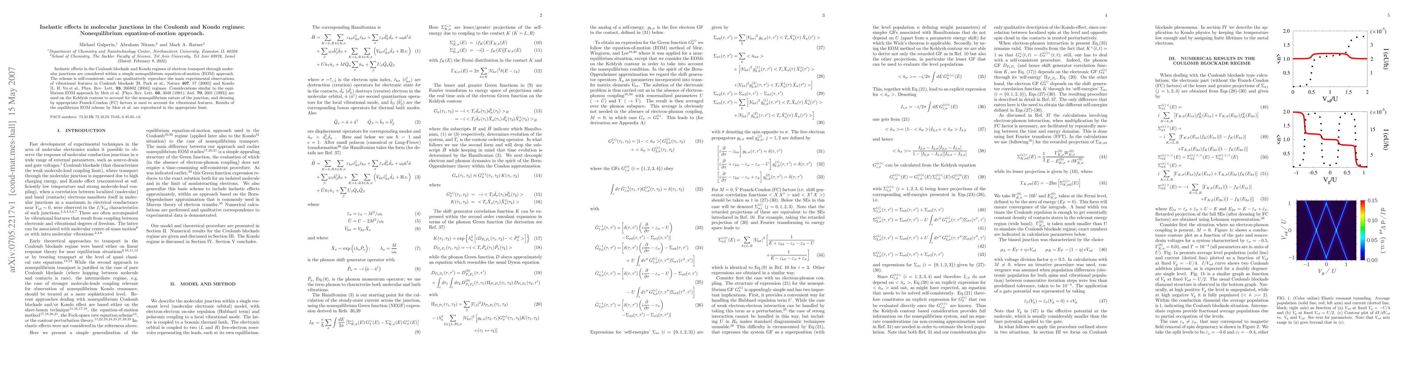 This paper investigates inelastic effects in electron transport through molecular junctions in the Coulomb and Kondo regimes using a nonequilibrium equation-of-motion approach. The method qualitatively reproduces experimental observations of vibrational features in both regimes and accounts for the nonequilibrium nature of the junction.