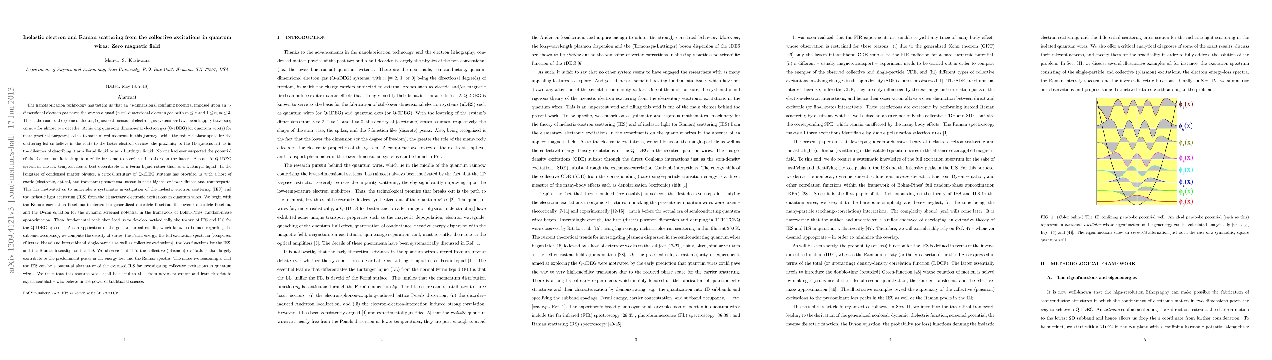 This paper investigates inelastic electron and Raman scattering from collective excitations in quantum wires without an applied magnetic field. It explores the quasi-one-dimensional electron gas systems and their exotic electronic and optical phenomena, using Kubo's correlation functions to derive the dynamic dielectric function and related theoretical frameworks.