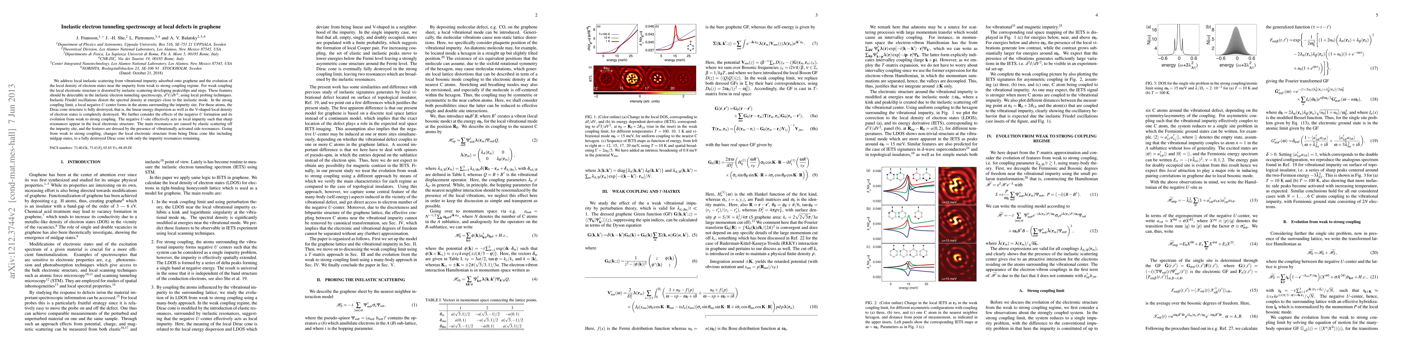 This paper investigates the impact of vibrational impurities on the local density of electron states in graphene through inelastic electron tunneling spectroscopy, revealing how the structure changes from weak to strong coupling, transitioning from distorted Dirac cone features to a fully destroyed Dirac cone with impurity resonances.