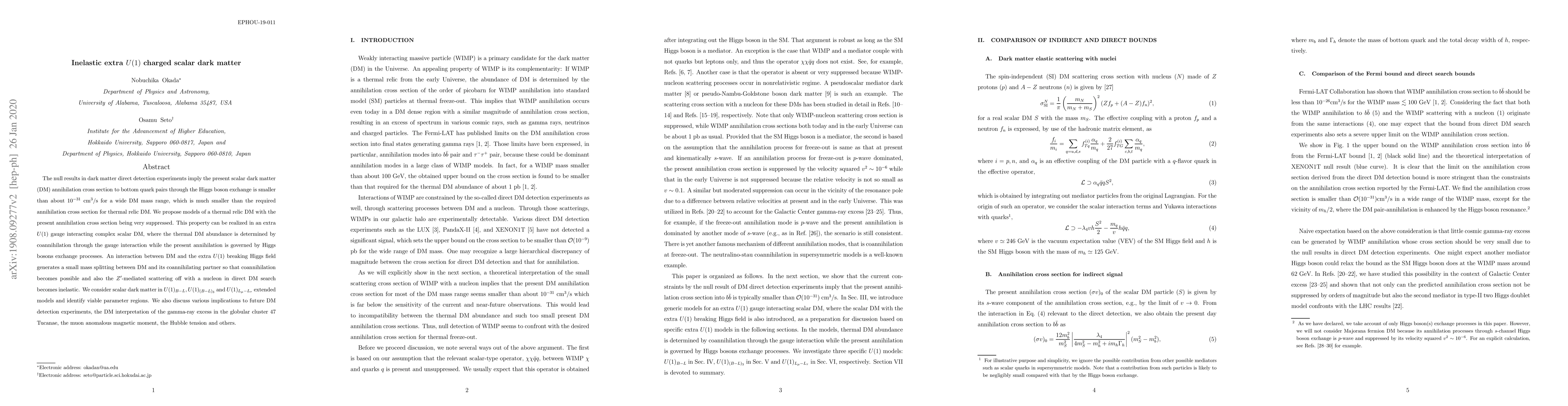 The null results in dark matter direct detection experiments imply the present scalar dark matter (DM) annihilation cross section to bottom quark pairs through the Higgs boson exchange is smaller than about $10^{-31}$ cm$^3/$s for a wide DM mass range, which is much smaller than the required annihilation cross section for thermal relic DM. We propose models of a thermal relic DM with the present annihilation cross section being very suppressed. This property can be realized in an extra $U(1)$ gauge interacting complex scalar DM, where the thermal DM abundance is determined by coannihilation through the gauge interaction while the present annihilation is governed by Higgs bosons exchange processes. An interaction between DM and the extra $U(1)$ breaking Higgs field generates a small mass splitting between DM and its coannihilating partner so that coannihilation becomes possible and also the $Z'$-mediated scattering off with a nucleon in direct DM search becomes inelastic. We consider scalar dark matter in $U(1)_{B-L}, U(1)_{(B-L)_3}$ and $U(1)_{L_\mu-L_\tau}$ extended models and identify viable parameter regions. We also discuss various implications to future DM detection experiments, the DM interpretation of the gamma-ray excess in the globular cluster 47 Tucanae, the muon anomalous magnetic moment, the Hubble tension and others.
