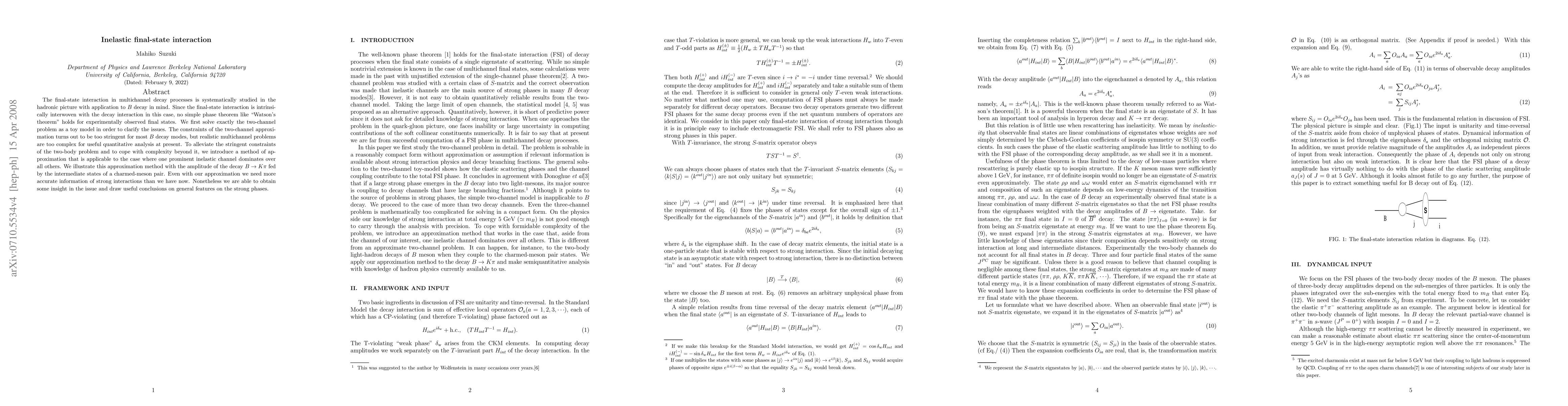 The final-state interaction in multichannel decay processes is sytematically studied with application to B decay in mind. Since the final-state inteaction is intrinsically interwoven with the decay interaction in this case, no simple phase theorem like "Watson's theorem" holds for experimentally observed final states. We first examine in detail the two-channel problem as a toy-model to clarify the issues and to remedy common mistakes made in earlier literature. Realistic multichannel problems are too challenging for quantitative analysis. To cope with mathematical complexity, we introduce a method of approximation that is applicable to the case where one prominant inelastic channel dominates over all others. We illustrate this approximation method in the amplitude of the decay B to pi K fed by the intermediate states of a charmed meson pair. Even with our approximation we need more accurate information of strong interactions than we have now. Nonethless we are able to obtain some insight in the issue and draw useful conclusions on general fearyres on the strong phases.