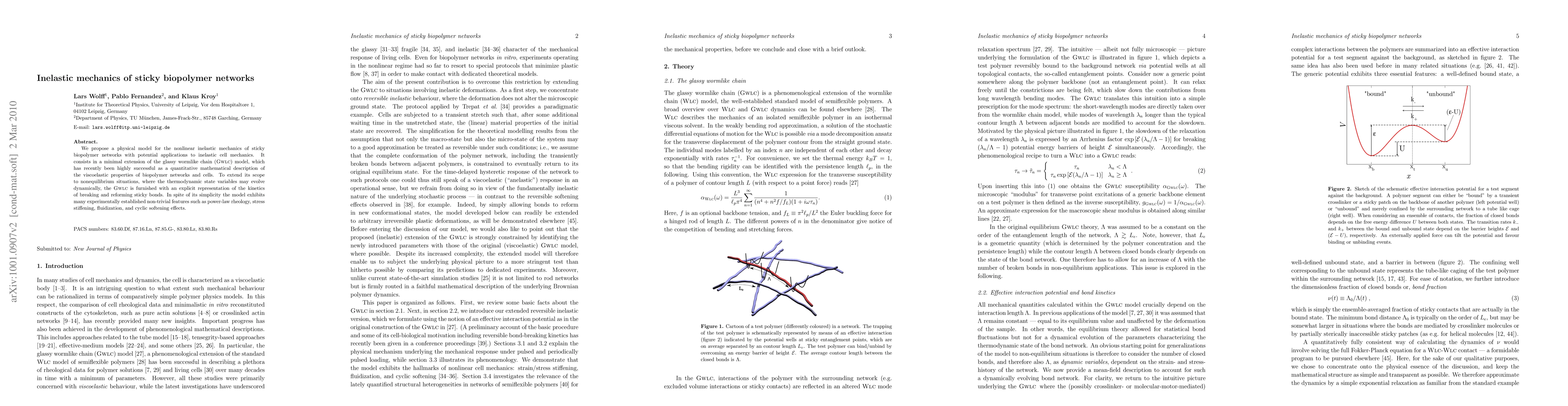 This paper proposes a physical model extending the glassy wormlike chain (GWLC) model to describe the nonlinear inelastic mechanics of sticky biopolymer networks, incorporating kinetics for breaking and reforming sticky bonds. The model captures experimentally observed phenomena like power-law rheology and cyclic softening effects.