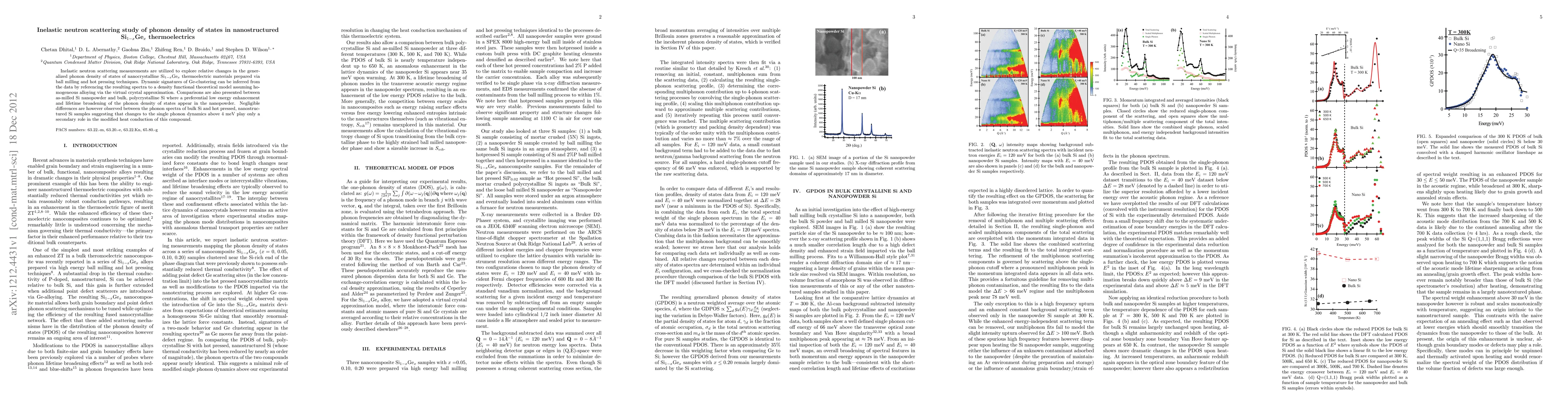 Inelastic neutron scattering measurements are utilized to explore relative changes in the generalized phonon density of states of nanocrystalline Si1xGex thermoelectric materials prepared via ball milling and hot-pressing techniques. Dynamic signatures of Ge clustering can be inferred from the data by referencing the resulting spectra to a density functional theoretical model assuming homogeneous alloying via the virtual-crystal approximation. Comparisons are also presented between as-milled Si nanopowder and bulk, polycrystalline Si where a preferential low-energy enhancement and lifetime broadening of the phonon density of states appear in the nanopowder. Negligible differences are however observed between the phonon spectra of bulk Si and hot pressed, nanostructured Si samples suggesting that changes to the single phonon dynamics above 4 meV play only a secondary role in the modified heat conduction of this compound.