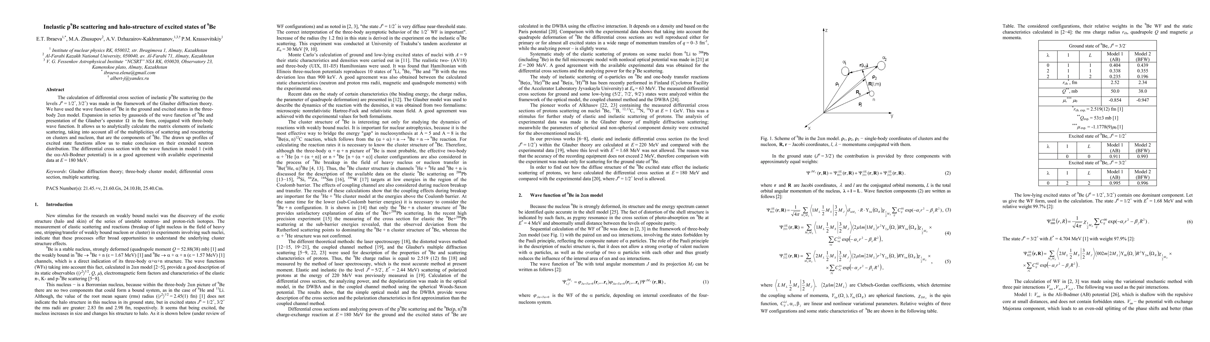 The calculation of the differential cross section of the inelastic p9Be scattering (to the levels J = 1/2, 3/2) was made in the framework of the Glauber diffraction theory. We used the wave function of 9Be in the ground and excited states in the three-body 2alpha-n model. Expansion in series by gaussoids of the wave function of 9Be and presentation of the Glauber operator in the form, conjugated with three-body wave function, allow us to calculate analytically the matrix elements of inelastic scattering, taking into account all of the multiplicities of scattering and rescattering on clusters and nucleon, that are the components of 9Be. The drawn up profiles of excited state functions allow us to make conclusion on their extended neutron distributions. The differential cross section with the wave function in model 1 (with the alpha-alpha-Ali-Bodmer potential) is in a good agreement with available experimental data at E = 180 MeV.