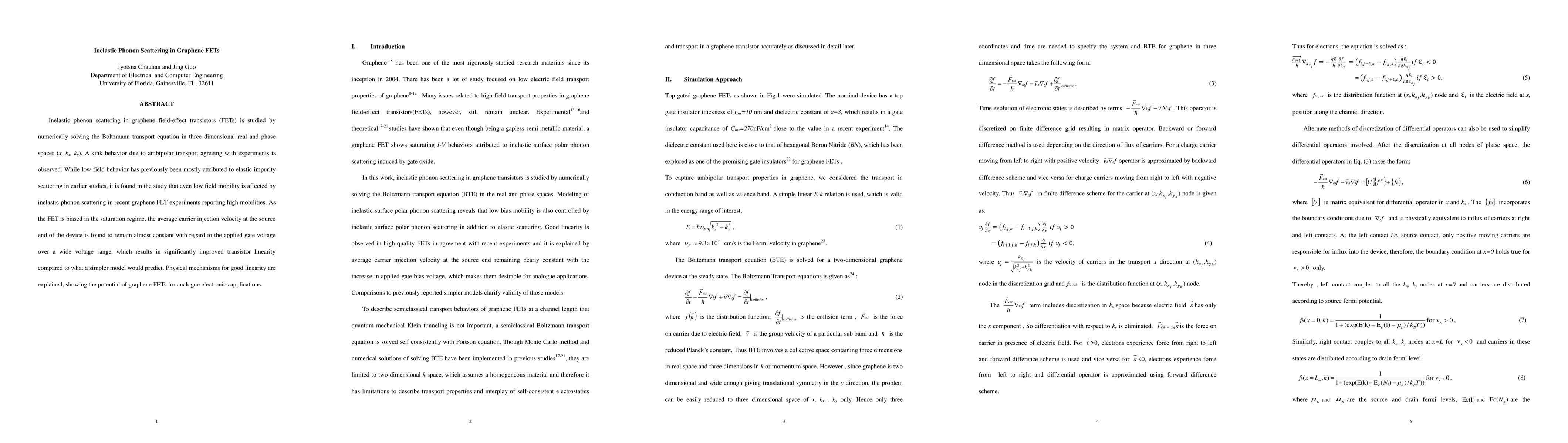 This study investigates the role of inelastic phonon scattering in graphene FETs, revealing that low field mobility is influenced by this scattering, contrary to previous assumptions. The research shows improved transistor linearity in the saturation regime due to a constant average carrier injection velocity, highlighting graphene FETs' potential for analogue electronics.