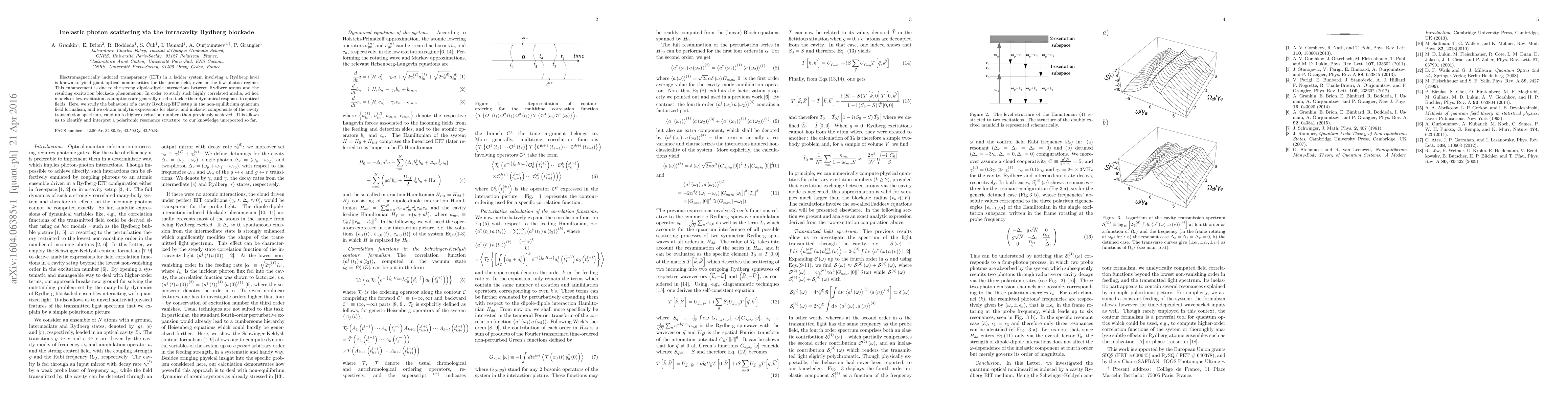 Electromagnetically induced transparency (EIT) in a ladder system involving a Rydberg level is known to yield giant optical nonlinearities for the probe field, even in the few-photon regime. This enhancement is due to the strong dipole-dipole interactions between Rydberg atoms and the resulting excitation blockade phenomenon. In order to study such highly correlated media, ad hoc models or low-excitation assumptions are generally used to tackle their dynamical response to optical fields. Here, we study the behaviour of a cavity Rydberg-EIT setup in the non-equilibrium quantum field formalism, and we obtain analytic expressions for elastic and inelastic components of the cavity transmission spectrum, valid up to higher excitation numbers than previously achieved. This allows us to identify and interpret a polaritonic resonance structure, to our knowledge unreported so far.