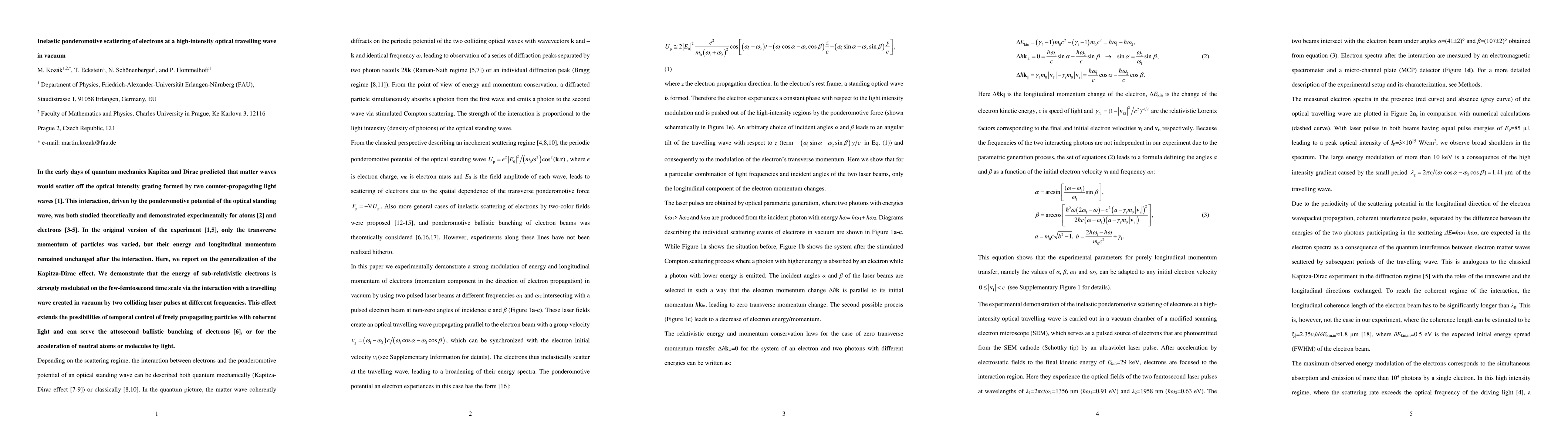 This paper reports on the modulation of sub-relativistic electron energy via inelastic scattering in a high-intensity optical travelling wave in vacuum, extending the Kapitza-Dirac effect to temporally control freely propagating particles. This discovery opens new avenues for attosecond ballistic bunching of electrons and light-driven acceleration of neutral atoms or molecules.