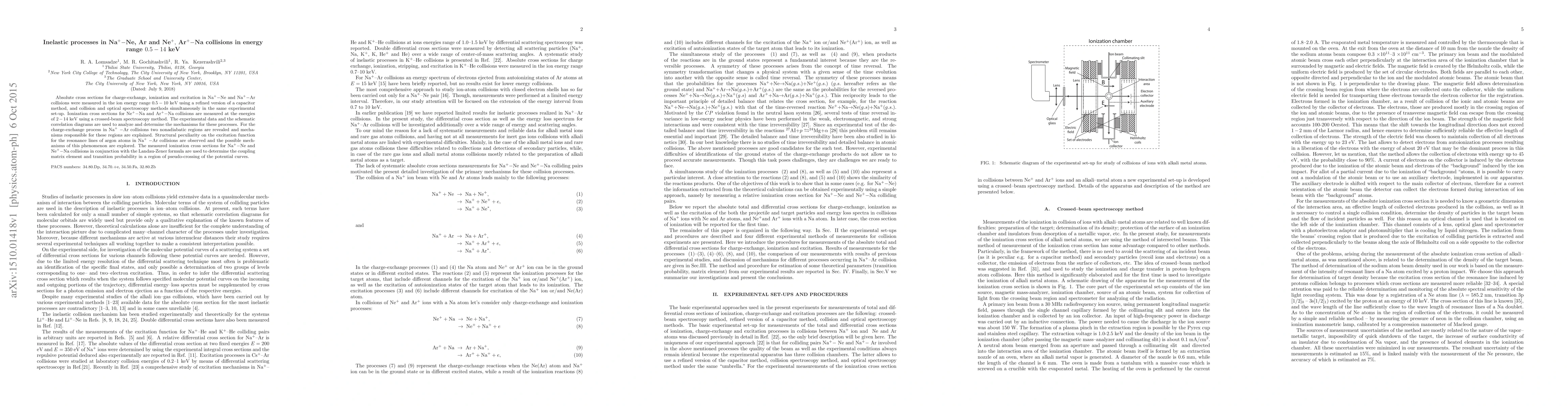 This paper measures absolute cross sections for charge-exchange, ionization, and excitation in various ion-atom collisions within the energy range of 0.5-14 keV, using refined capacitor and spectroscopy methods. It identifies mechanisms for these processes, including nonadiabatic regions in charge-exchange and resonance line excitation in argon atoms, and determines coupling matrix elements using the Landau-Zener formula.