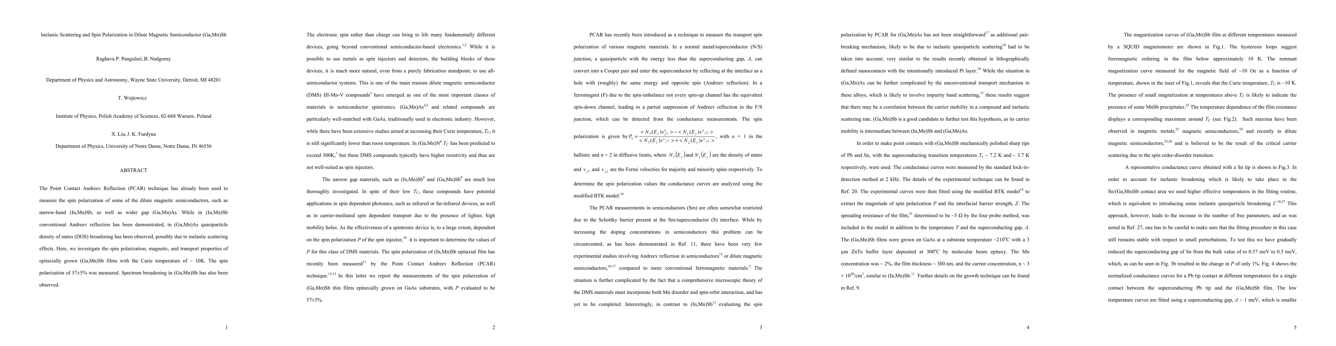 This paper investigates the spin polarization and transport properties of (Ga,Mn)Sb using the PCAR technique, finding a spin polarization of 57±5% and spectrum broadening likely due to inelastic scattering effects. The study compares these results with previous findings in (In,Mn)Sb and (Ga,Mn)As.
